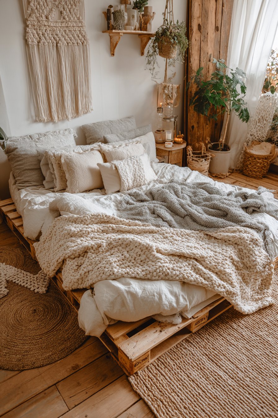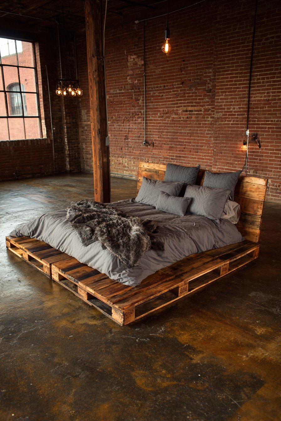 This cozy low-bed bedroom idea offers particular appeal to renters, students, or anyone working with a limited budget who refuses to sacrifice style for affordability. The pallet bed can be constructed in a weekend with basic tools, and the clear matte sealant protects the wood while maintaining its natural appearance. Wide-angle perspectives reveal how this creative, repurposed design delivers authentic urban style, proving that great design doesn’t require expensive furniture—it requires vision, creativity, and willingness to think beyond conventional solutions.