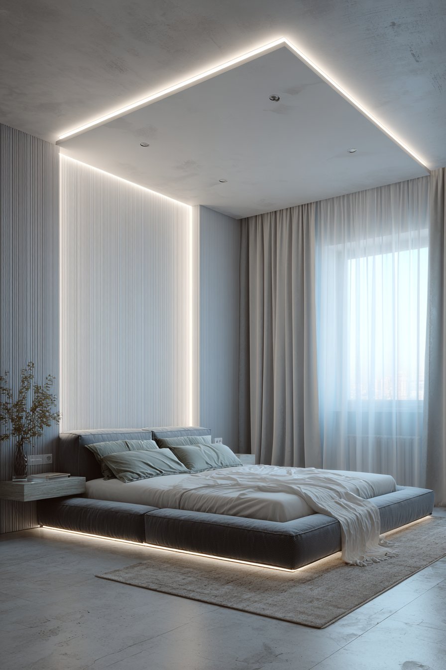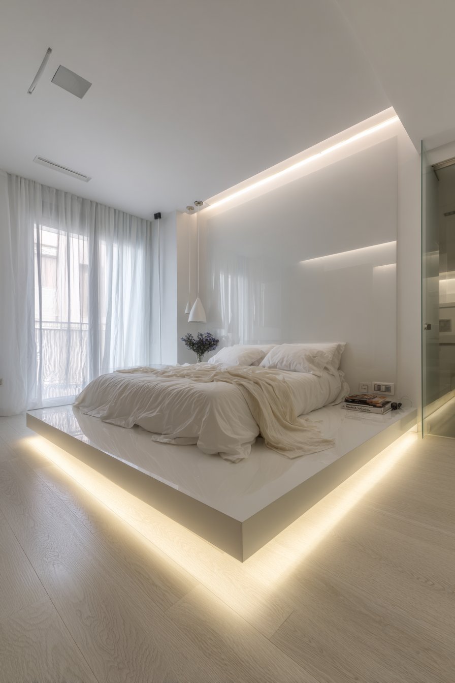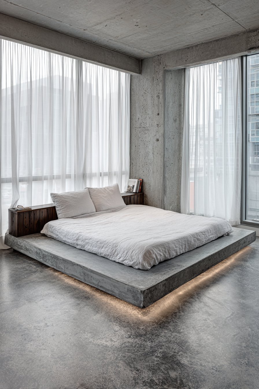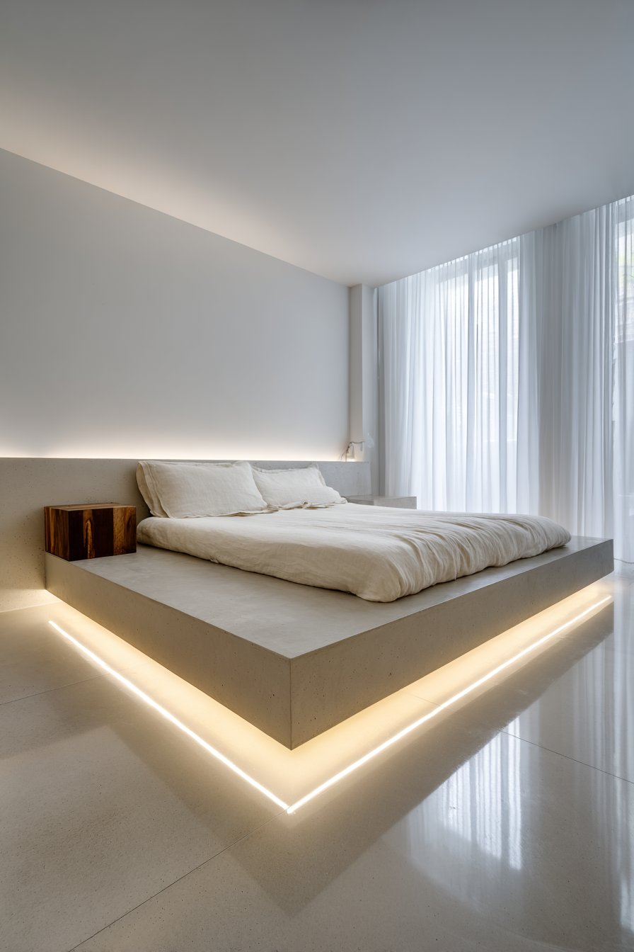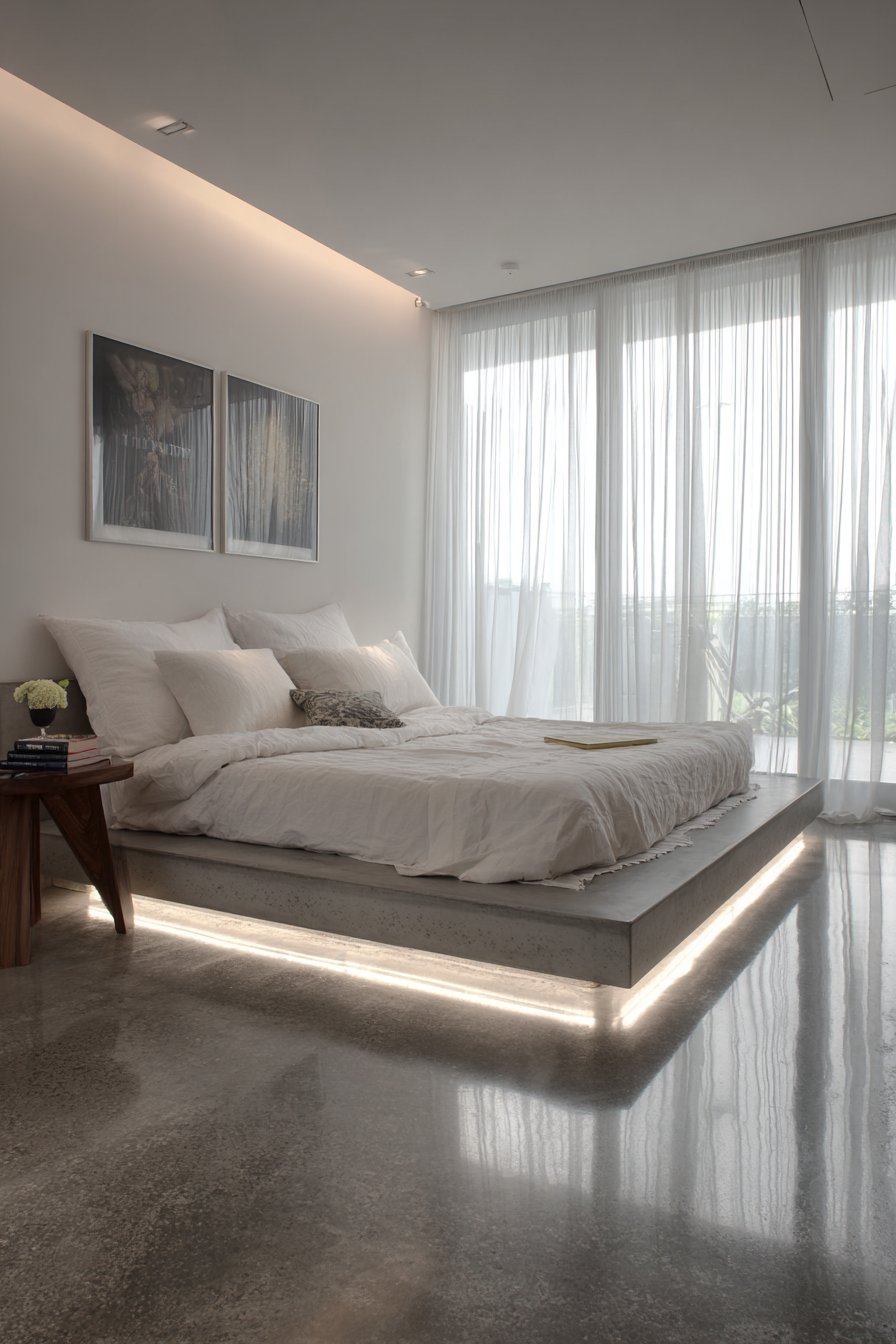 This cozy low-bed bedroom idea demonstrates how industrial materials can create surprisingly intimate spaces when handled with intention. A single low-profile side table in warm walnut wood introduces natural material that prevents the design from feeling too austere, while holding only minimal decor to maintain the clean aesthetic. The polished concrete flooring reflects light subtly, adding luminosity without shine, while the LED underlighting creates ambiance that can transform the mood from crisp and energizing to warm and relaxing with a simple adjustment of color temperature.