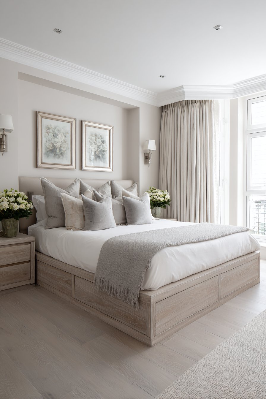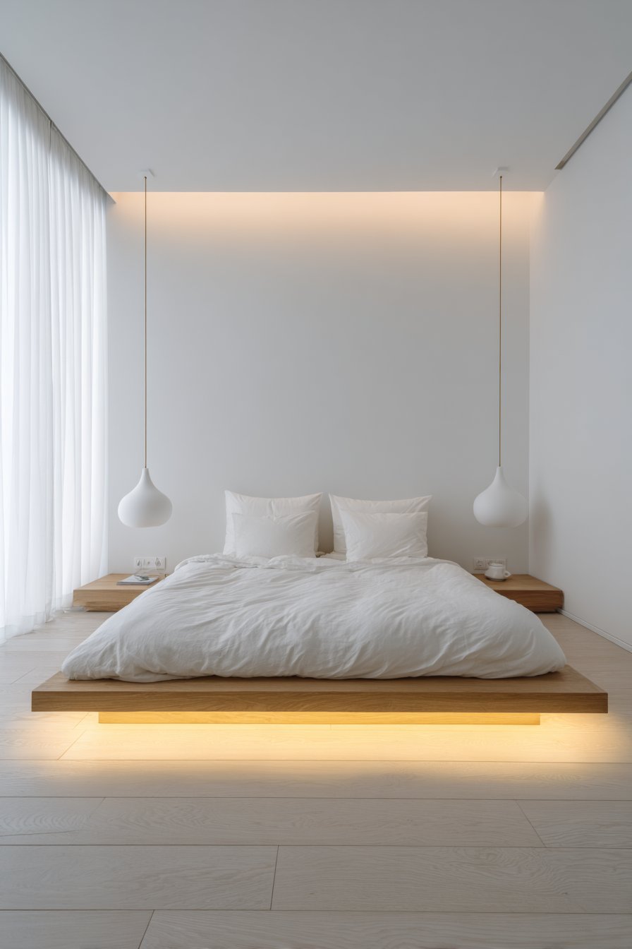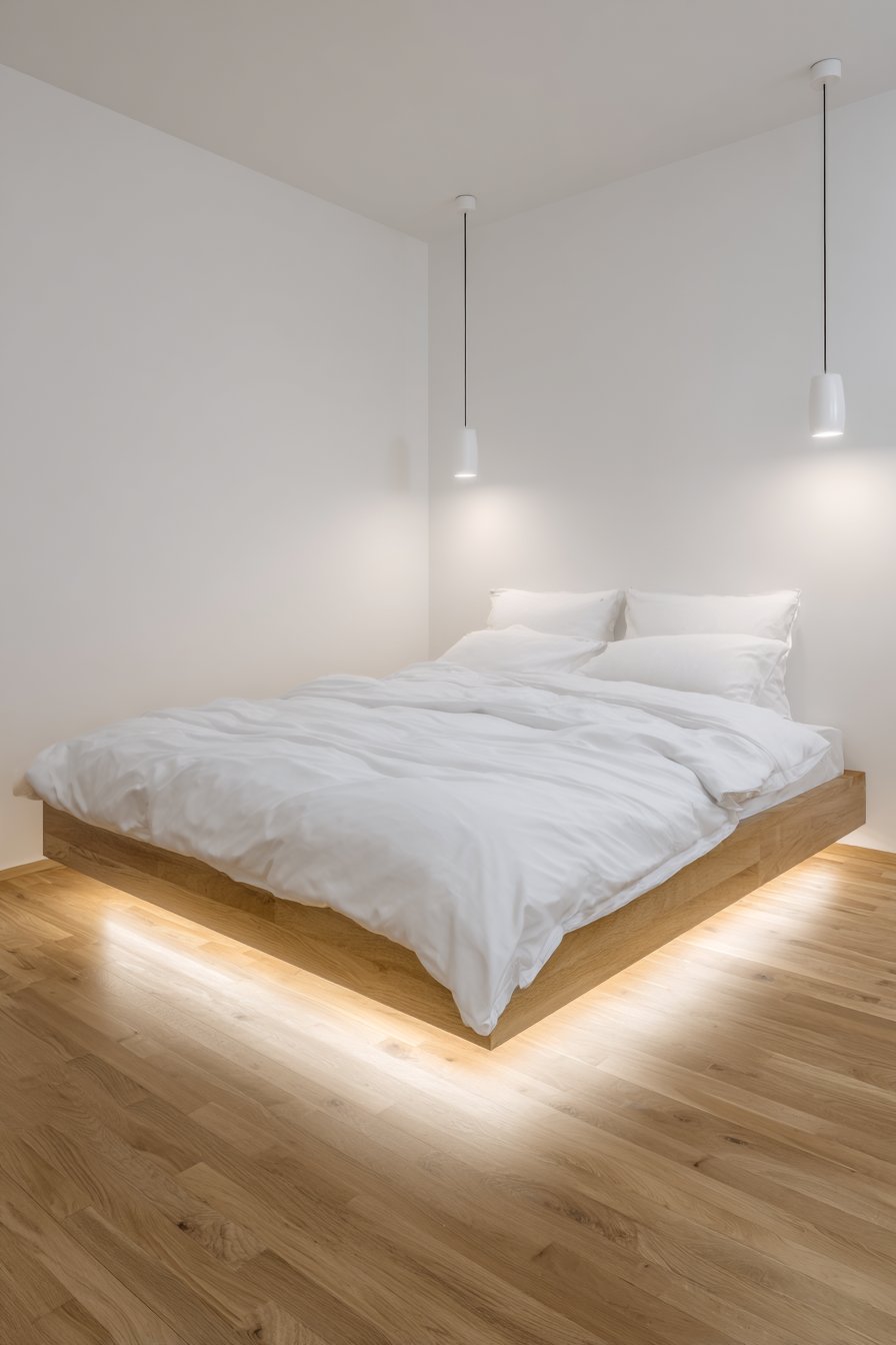 The aesthetic approach emphasizes clean modernism and geometric precision. Crisp white bedding with hotel-quality cotton creates sharp lines and pristine surfaces that enhance the floating illusion through their weightless appearance. Integrated LED lighting in the bed base creates ambient underglow that washes across the oak flooring, reinforcing the floating effect while providing soft illumination perfect for nighttime navigation. This cozy low-bed bedroom idea demonstrates how lighting can be both functional and theatrical, transforming a bedroom into a space of wonder.