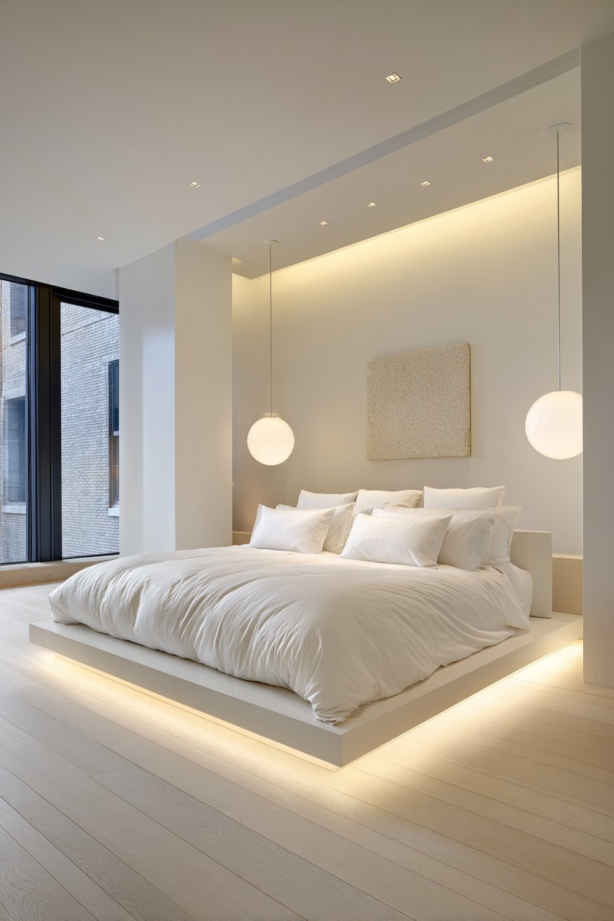 The supporting design elements maintain absolute minimalism to preserve the visual impact of the floating bed. Minimalist white walls provide a neutral backdrop that doesn’t compete for attention, while simple pendant fixtures offer necessary task lighting without disrupting the clean aesthetic. Professional architectural photography techniques would capture this space with perfect exposure, showcasing how innovative engineering and design thinking can transform a fundamental piece of furniture—the bed—into a conversation piece that still delivers exceptional comfort and functionality.