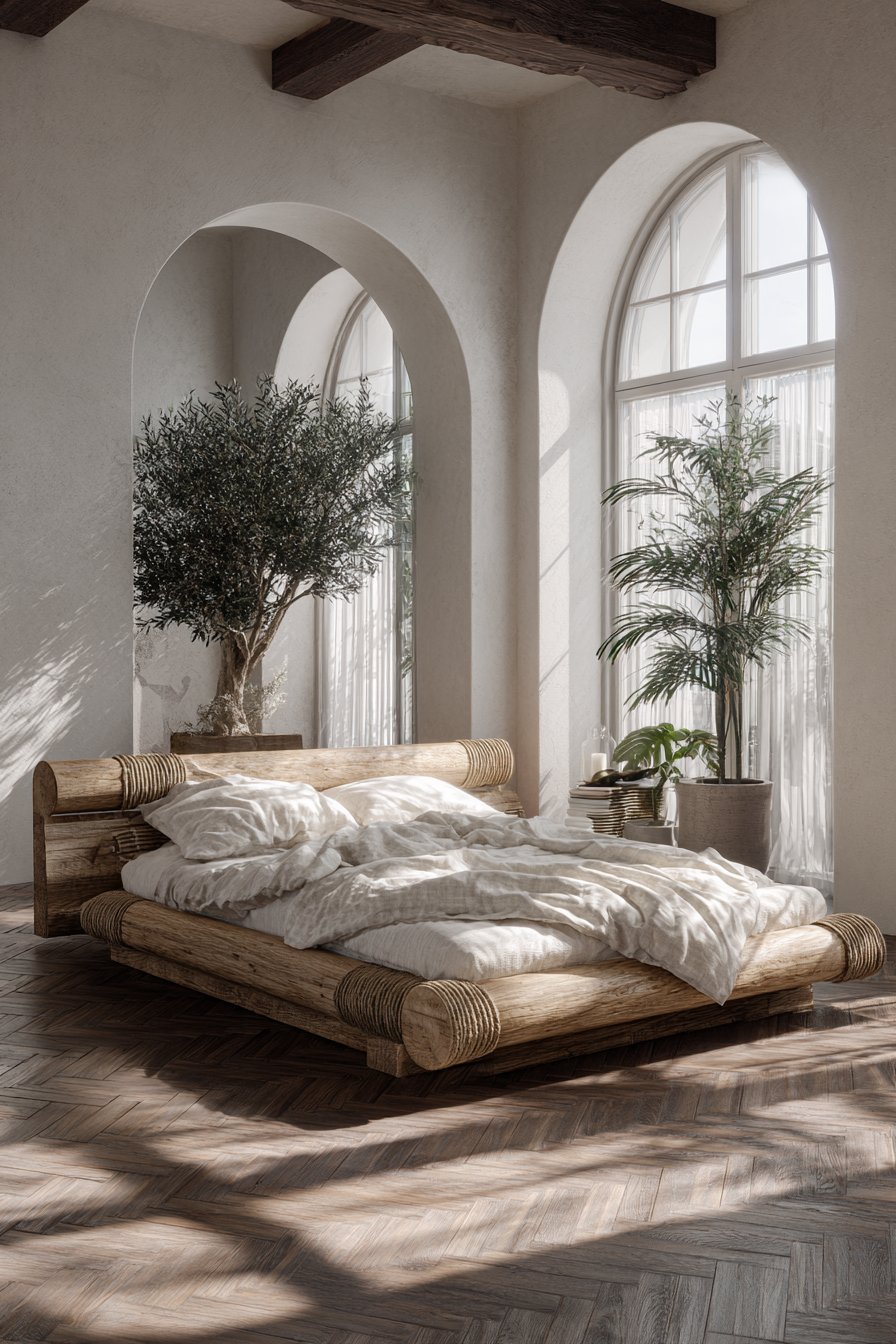 The design approach wisely allows the spectacular wood to be the undisputed focal point. Neutral bedding in natural linen provides comfortable simplicity without competing for visual attention, with the subtle texture and honest material complementing rather than overshadowing the wood’s natural beauty. The restrained color palette of natural wood tones, cream, and soft grey creates harmony that lets the eye rest on the intricate details of the wood grain without distraction.