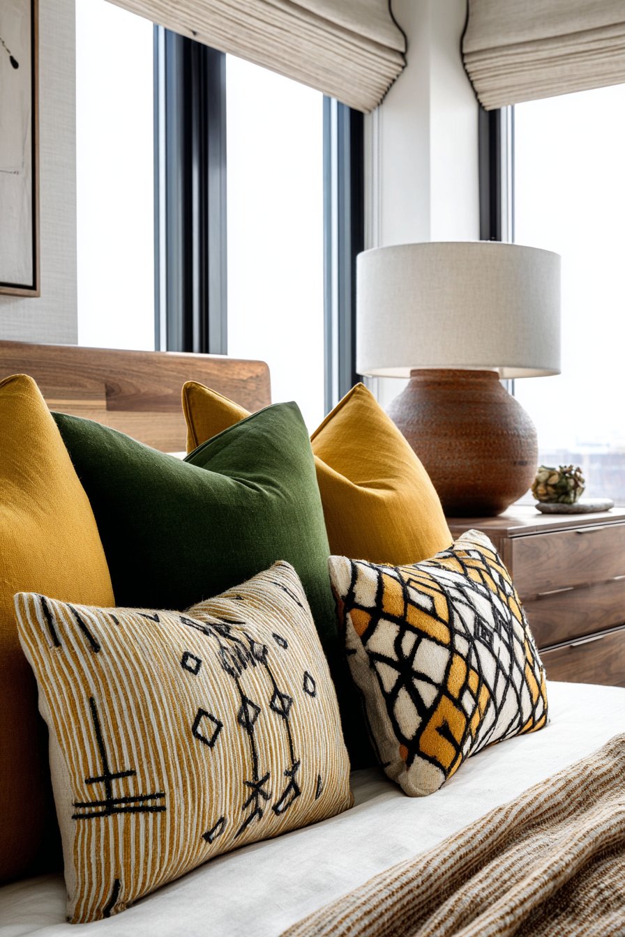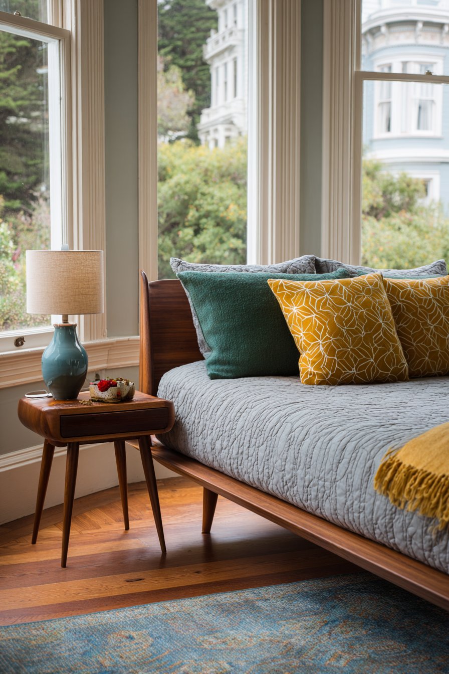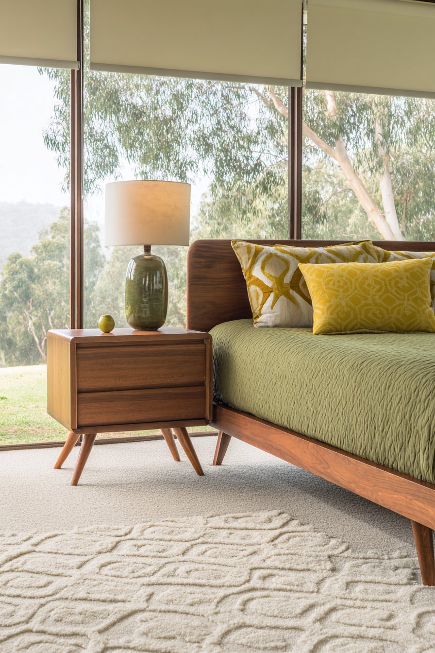 Color and pattern choices celebrate the bold, optimistic spirit of mid-century design. Geometric patterned throw pillows in mustard yellow and forest green accent neutral bedding, introducing the saturated hues that defined the era without overwhelming the space. These accent colors reference the period’s love of jewel tones and nature-inspired palettes, adding personality and historical authenticity. A vintage ceramic table lamp on a low walnut nightstand provides warm lighting while serving as a period-appropriate accessory that completes the retro narrative.