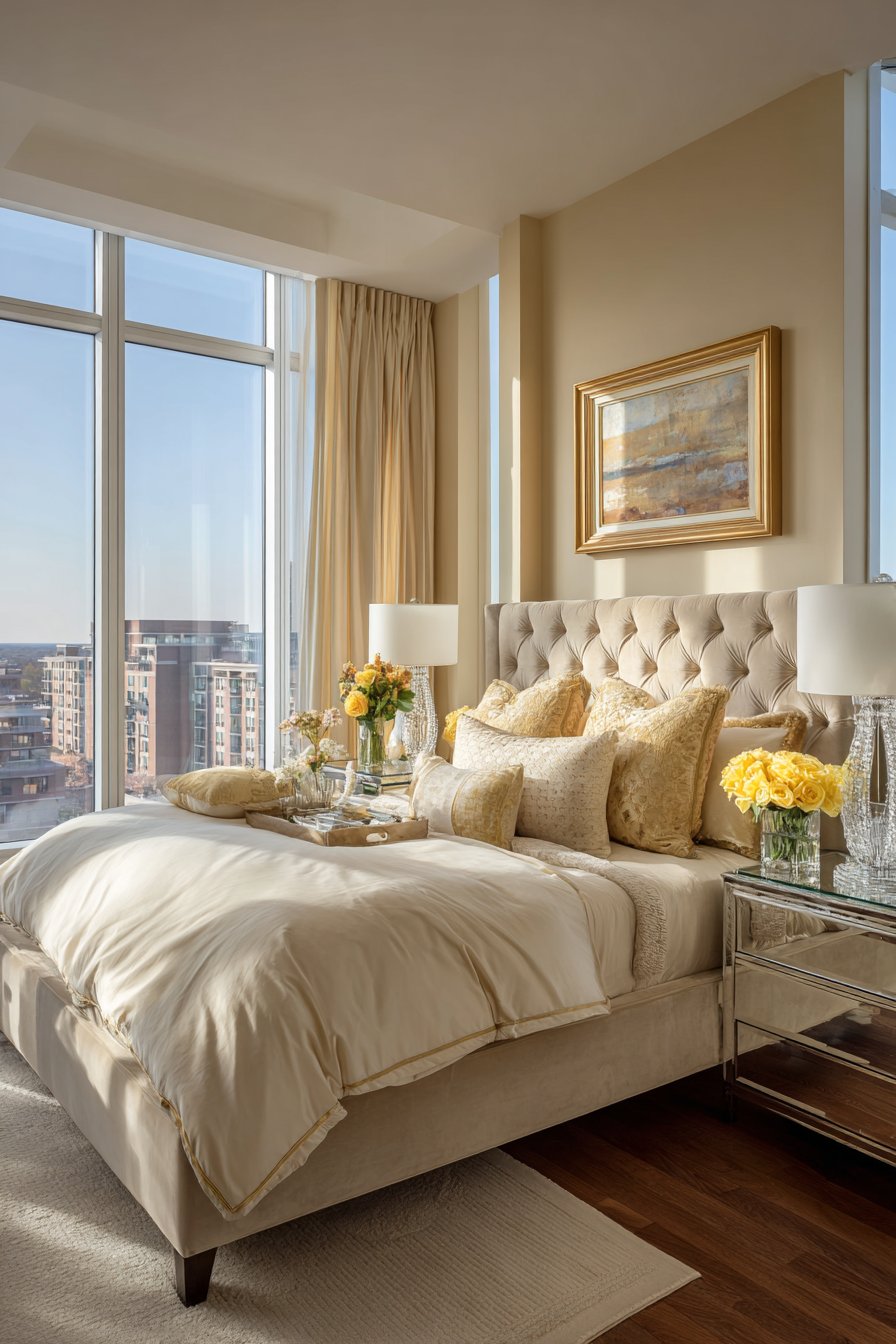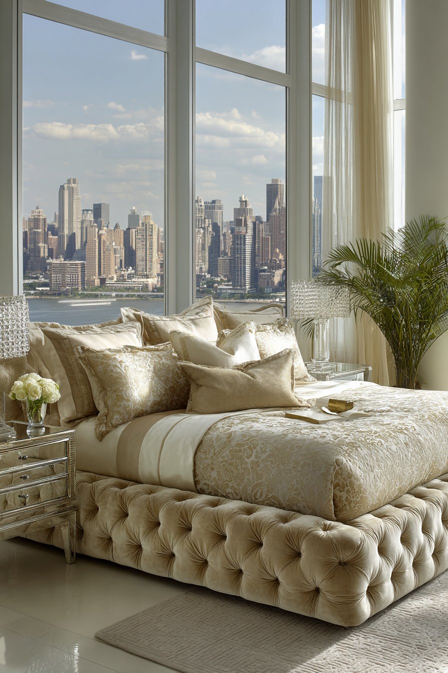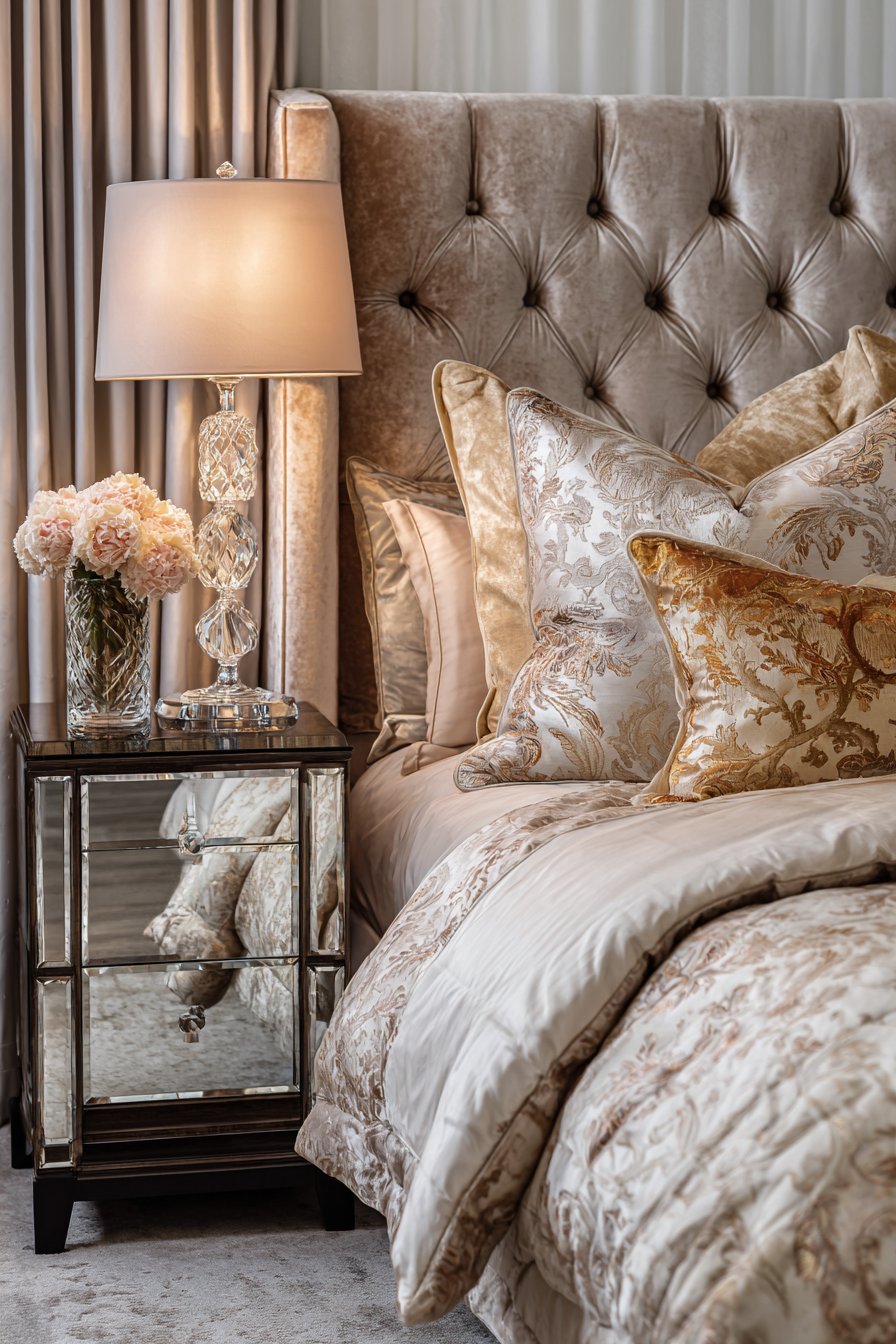 The bedding composition continues the luxurious theme through carefully selected fabrics and colors. Silk blend bedding in ivory and gold tones creates elegant layers that complement the champagne velvet without competing for attention. Each layer—from silk sheets to embroidered duvet covers to decorative pillows with metallic accents—contributes to a sense of refined luxury. Crystal table lamps on low mirrored nightstands provide sophisticated lighting while their reflective surfaces multiply light and add glamorous sparkle.