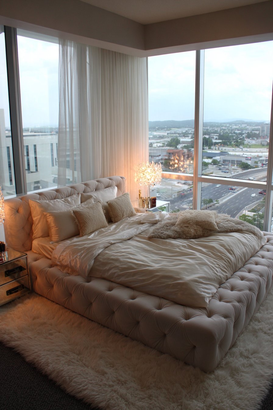 Indulge in opulent comfort with this cozy low-bed bedroom idea showcasing a luxurious low-profile upholstered bed with deep button tufting in champagne velvet fabric. The bed frame sits just six inches high, creating an intimate sleeping environment that feels grounded yet glamorous. The champagne color offers sophisticated neutrality with warm undertones that feel expensive and inviting, while the deep button tufting creates dimensional texture that catches light beautifully, appearing to shimmer as you move through the space.