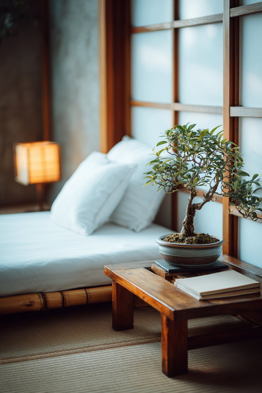 Supporting elements maintain the commitment to minimalism and mindful living. A single low wooden table holds carefully chosen items—a bonsai tree representing natural beauty in miniature, and a small reading lamp providing functional illumination. Soft natural lighting from paper screen windows creates diffused ambient light that changes gently throughout the day, encouraging awareness of time and season. The overall effect is meditative and calming, creating a bedroom that serves as a daily reminder to embrace simplicity and find contentment in the essential.