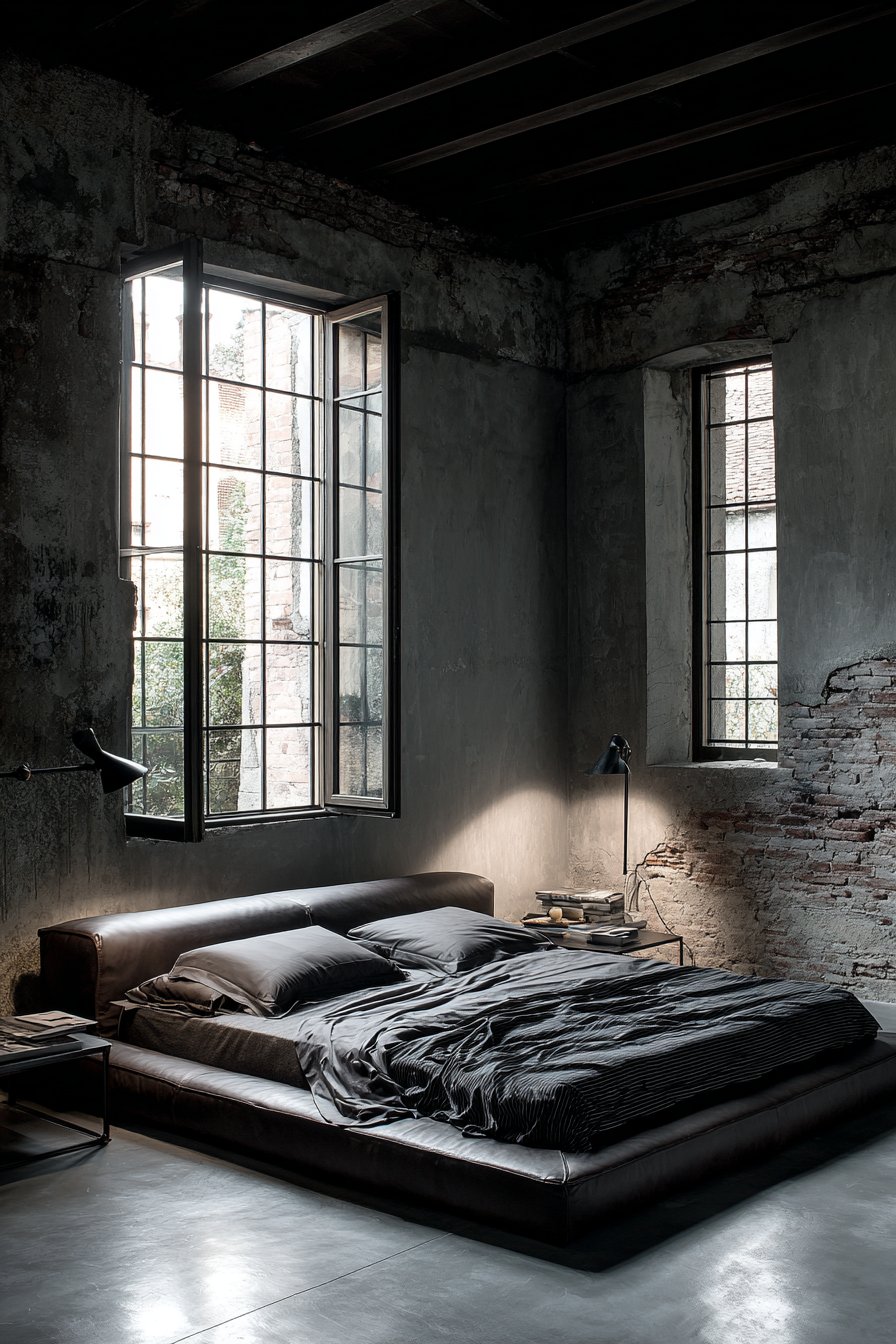 The color scheme maintains sophisticated restraint through monochromatic layering. Bedding in charcoal and slate grey creates tonal variations that add depth without introducing competing colors, allowing the cognac leather to serve as the warm accent that prevents the palette from feeling cold or harsh. This cozy low-bed bedroom idea demonstrates advanced color theory application—the warm brown leather and cool grey textiles create temperature contrast that makes both elements more striking than they would be in isolation.