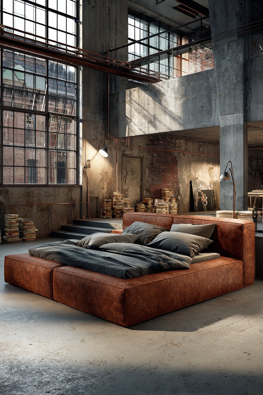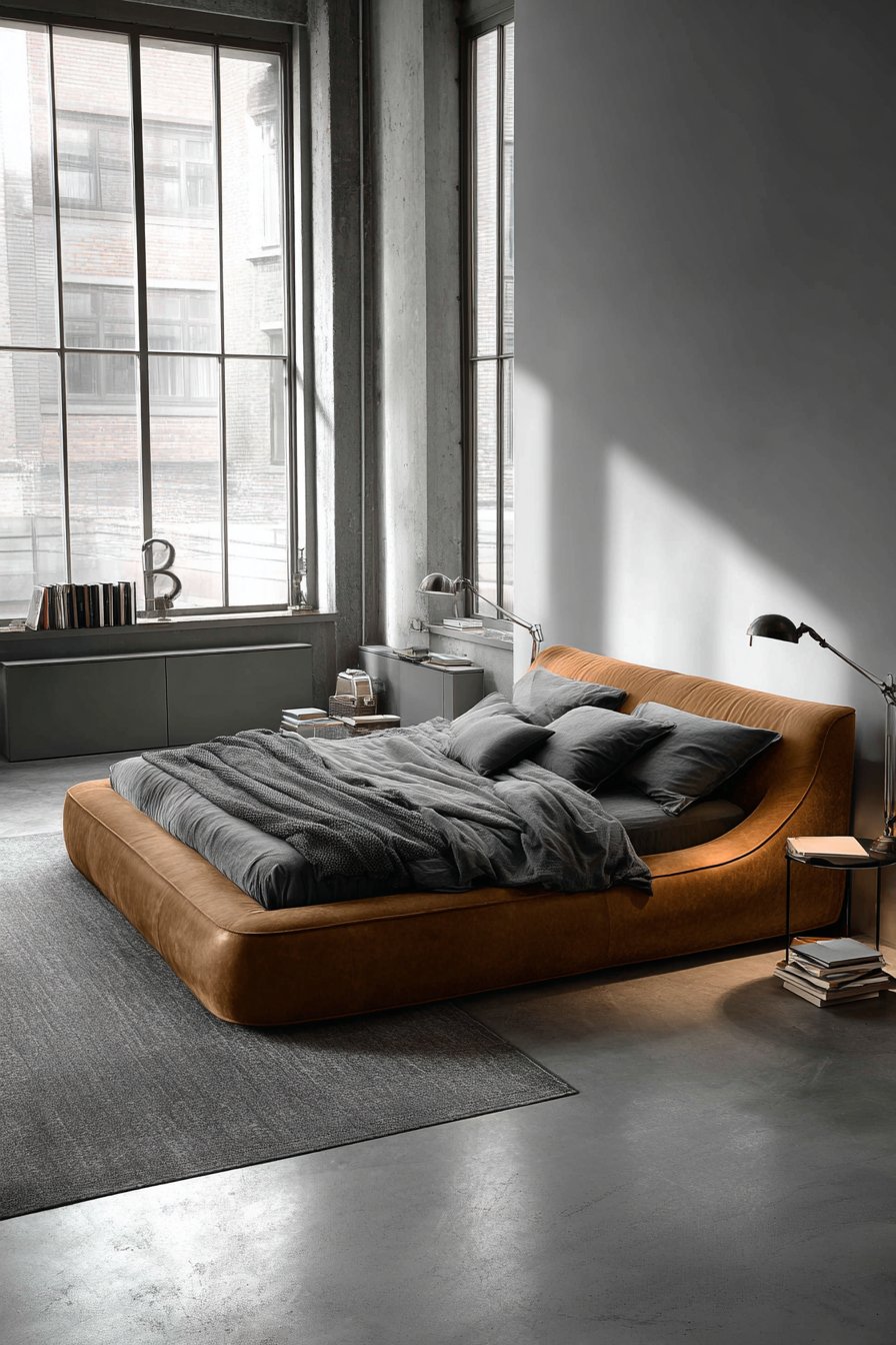 Discover industrial elegance with this cozy low-bed bedroom idea featuring a sleek contemporary low bed with leather upholstered frame in cognac brown positioned close to polished concrete floors. The leather upholstery introduces rich, warm tones and develops beautiful patina over time, becoming more characterful with age rather than appearing worn. This material choice references both mid-century design classics and contemporary industrial aesthetics, creating cross-generational appeal that transcends specific trends.
