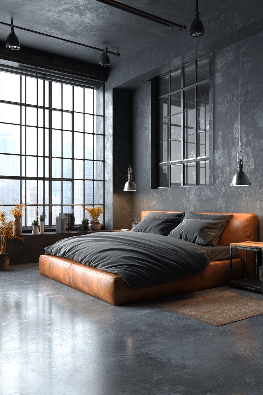 Industrial architectural elements and contemporary lighting complete the urban aesthetic. Metal side tables with powder-coated finishes provide functional surfaces while reinforcing the industrial theme, and adjustable wall-mounted reading lights deliver focused task lighting without requiring floor or table space. Large factory-style windows allow abundant natural light while their metal frames and generous proportions reference converted loft buildings. The overall composition captures urban sophistication—a bedroom that feels both refined and edgy, comfortable yet distinctly contemporary.