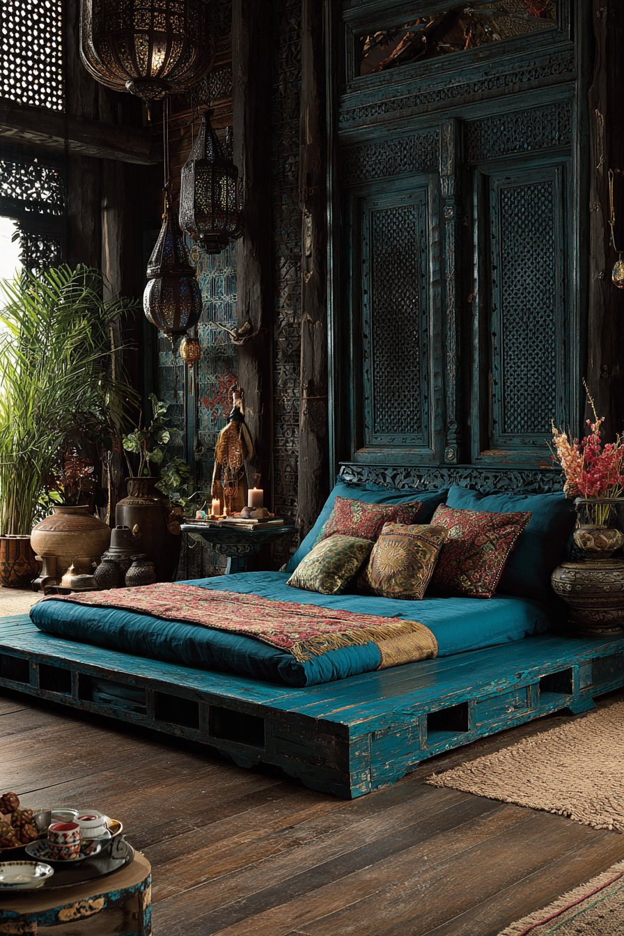 Experience North African richness with this cozy low-bed bedroom idea showcasing a Moroccan-inspired low mattress arrangement on an ornate carved wooden platform painted in deep turquoise. The ground-level sleeping surface emphasizes cultural tradition where floor-level seating and sleeping create intimate, communal atmospheres. The intricately carved platform showcases traditional Moroccan woodworking techniques, with geometric patterns and arabesque details that demonstrate master craftsmanship, while the turquoise paint adds vibrant color that’s simultaneously bold and traditional.