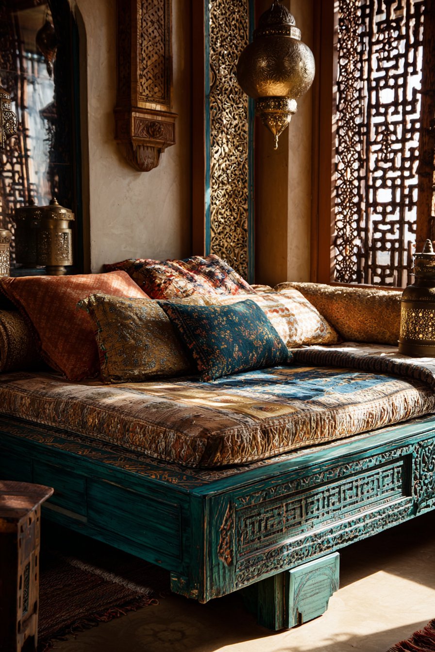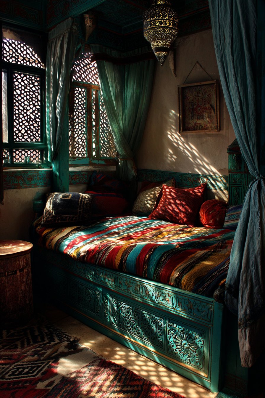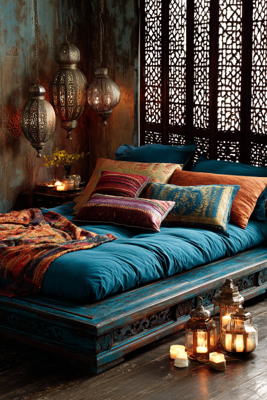 Lighting design adds final theatrical touches. Hanging lanterns cast intricate shadow patterns across walls and textiles, creating constantly shifting light displays that make the space feel alive and magical. Natural light filters through geometric window screens, creating dappled illumination that references traditional mashrabiya woodwork. The overall effect transports you to Moroccan riads and kasbahs, creating an exotic retreat that celebrates color, pattern, and handcrafted beauty.