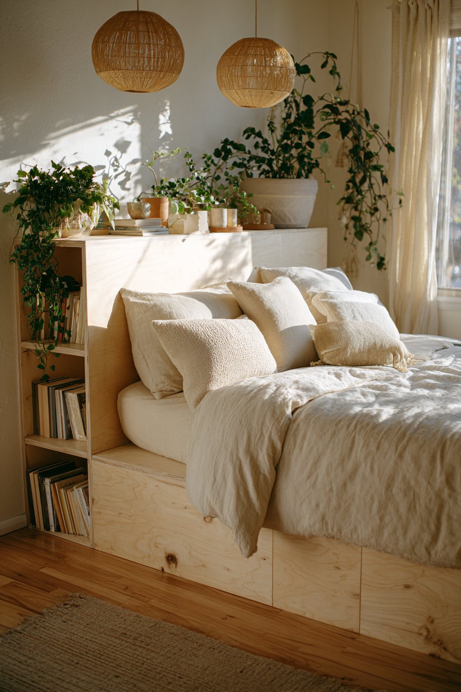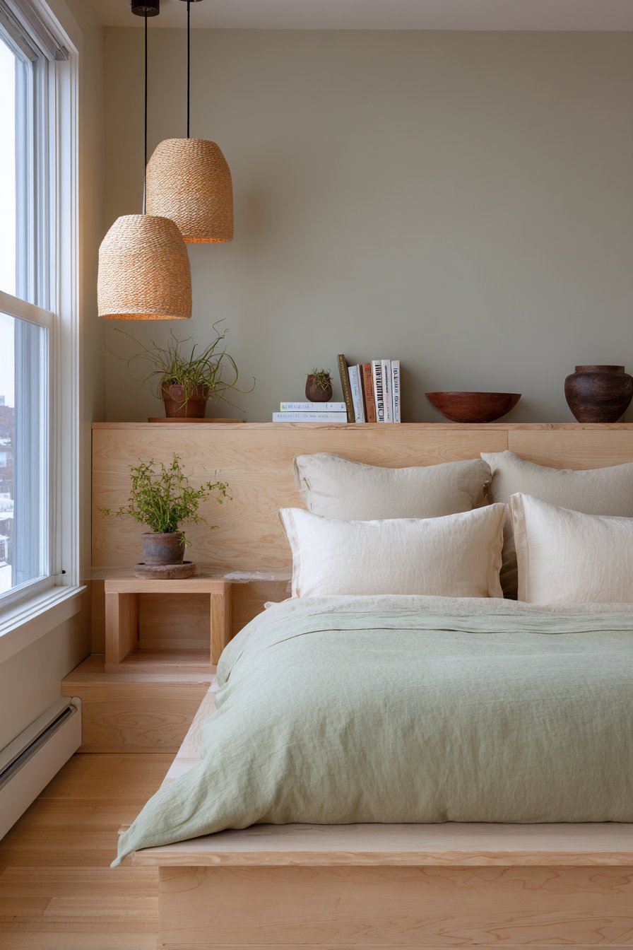 Embrace eco-conscious design with this cozy low-bed bedroom idea featuring a minimalist low platform bed with integrated solid wood headboard shelf displaying small plants and books. The simple platform design in light birch sits five inches from bamboo flooring, creating a completely sustainable bedroom foundation where every material choice reflects environmental responsibility. The integrated headboard shelf demonstrates how thoughtful design can combine form and function, eliminating the need for separate nightstands while providing essential display and storage space.