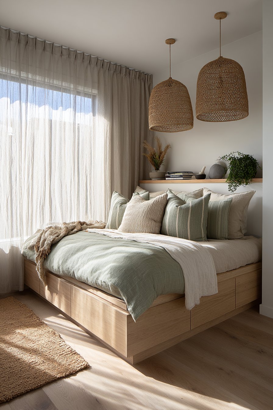 Lighting choices complete the eco-conscious vision. Pendant lights with woven shades made from natural materials like rattan, seagrass, or bamboo filter light softly while showcasing sustainable design. Morning sunlight through linen curtains provides natural illumination that connects daily rhythms to solar cycles, reducing reliance on artificial lighting. This cozy low-bed bedroom idea proves that sustainable design doesn’t require sacrifice—it simply requires thoughtful material selection and commitment to environmental responsibility, resulting in spaces that feel as good ethically as they do aesthetically.