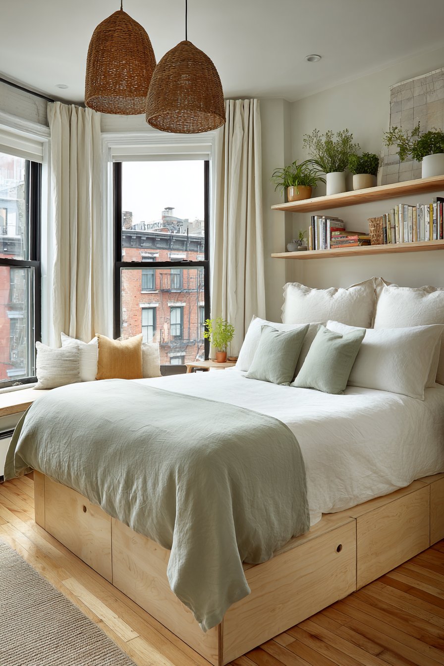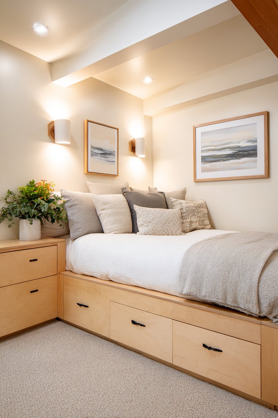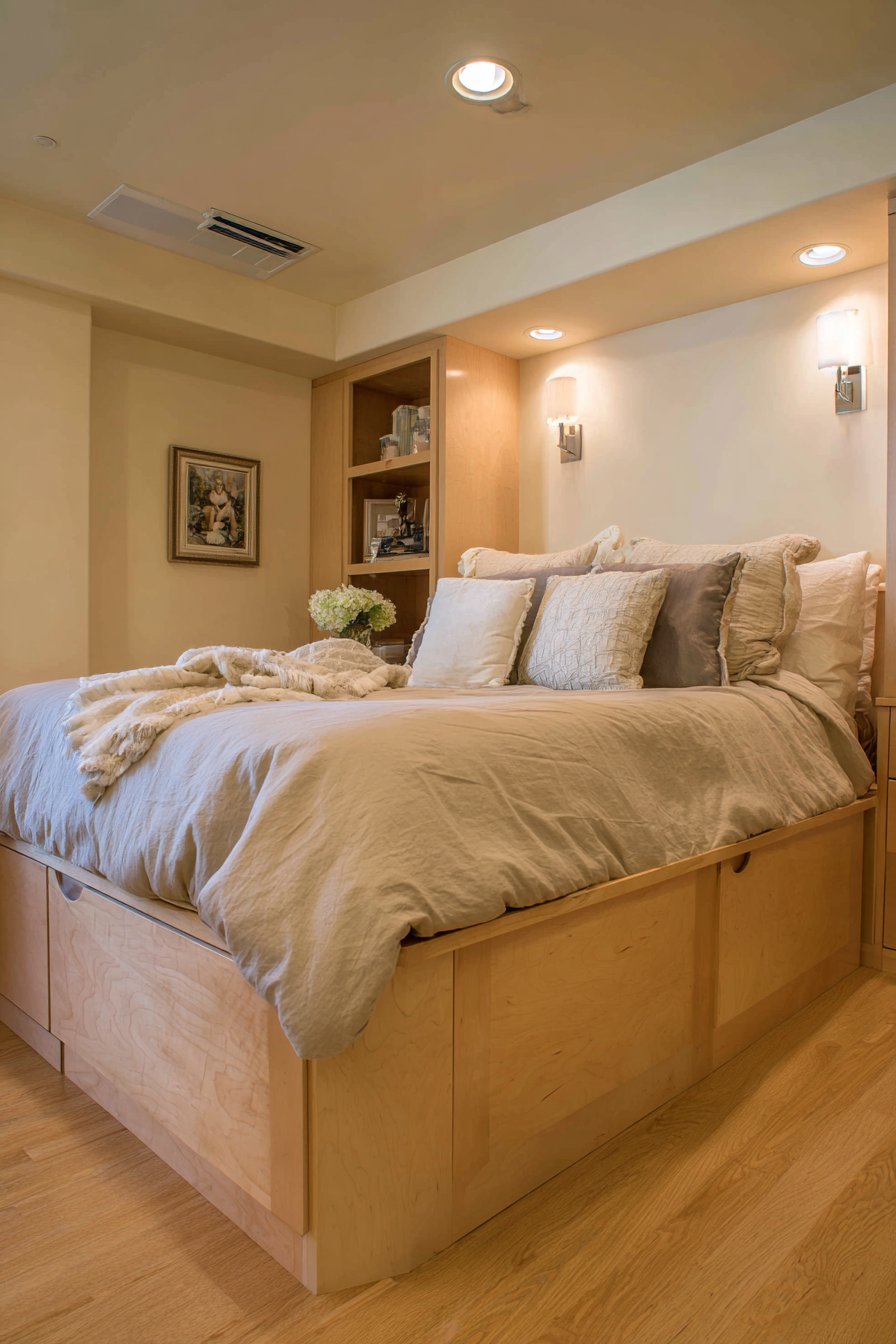 - Invest in custom or semi-custom platform beds with built-in storage for maximum space efficiency