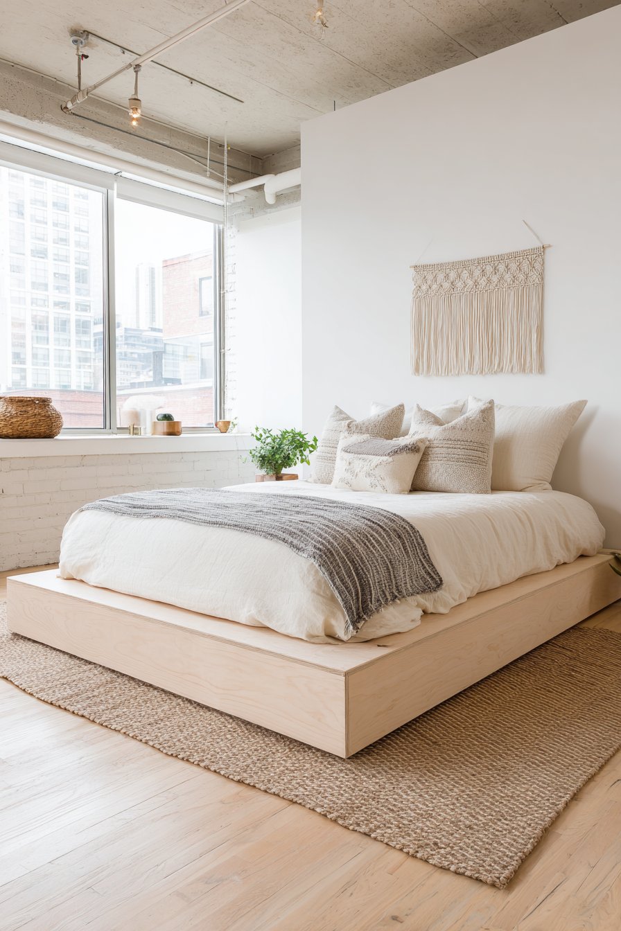 Scandinavian design has conquered the interior design world with its perfect balance of functionality, beauty, and accessibility, and this cozy low-bed bedroom idea captures that aesthetic brilliantly. An ultra-low profile platform bed crafted from light ash finish sits directly on natural oak hardwood flooring, creating a seamless connection between furniture and architecture. The bed is layered with textured throws in soft grey and cream tones, each carefully selected for both visual appeal and tactile comfort. This approach to bedding transforms a simple sleeping surface into an inviting cloud of texture that beckons you to sink in and relax.
