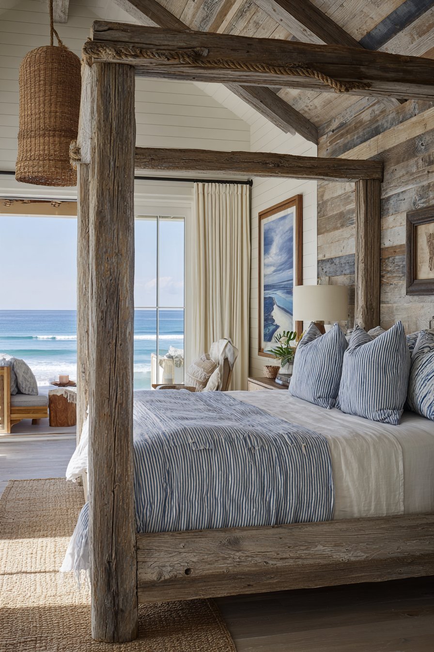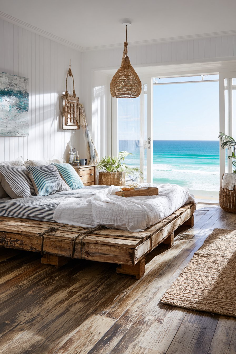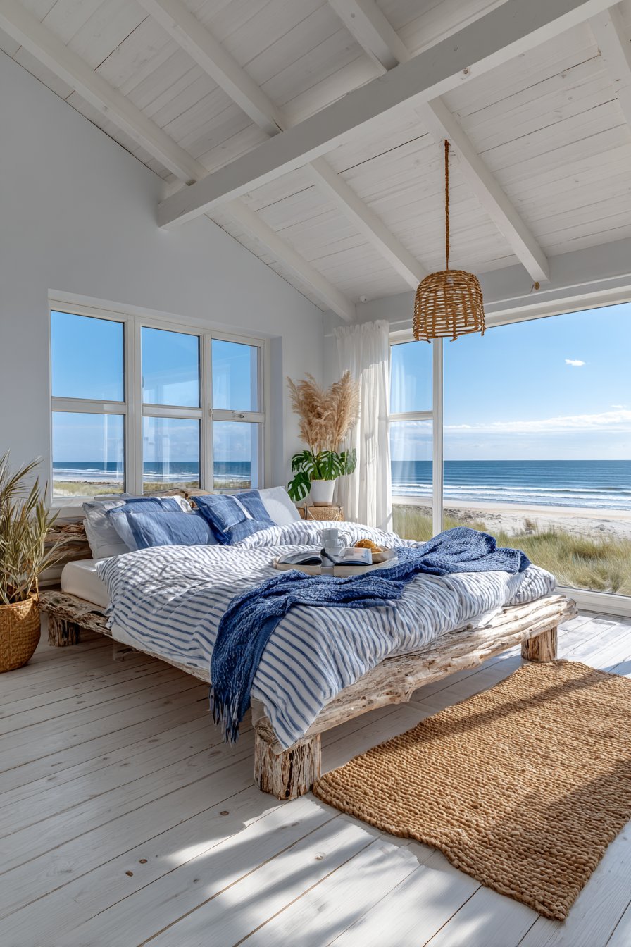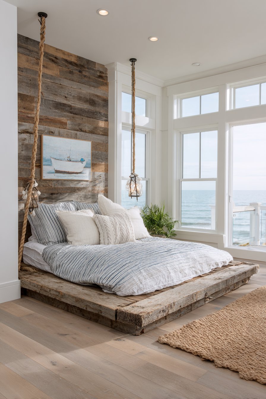 Natural and nautical lighting complete the seaside atmosphere. A rope pendant light references maritime vessels while providing functional illumination, and natural jute rugs add warm texture that prevents the bright color scheme from feeling cold. The positioning of this cozy low-bed bedroom idea near windows with ocean views creates seamless indoor-outdoor connection, making the bedroom feel like an extension of the beach itself. Even without actual water views, this design successfully evokes coastal living through authentic materials and thoughtful styling.