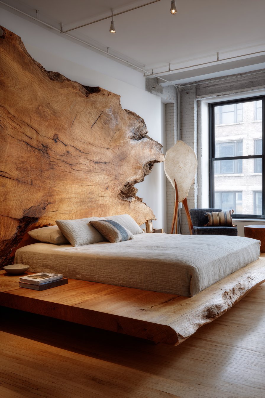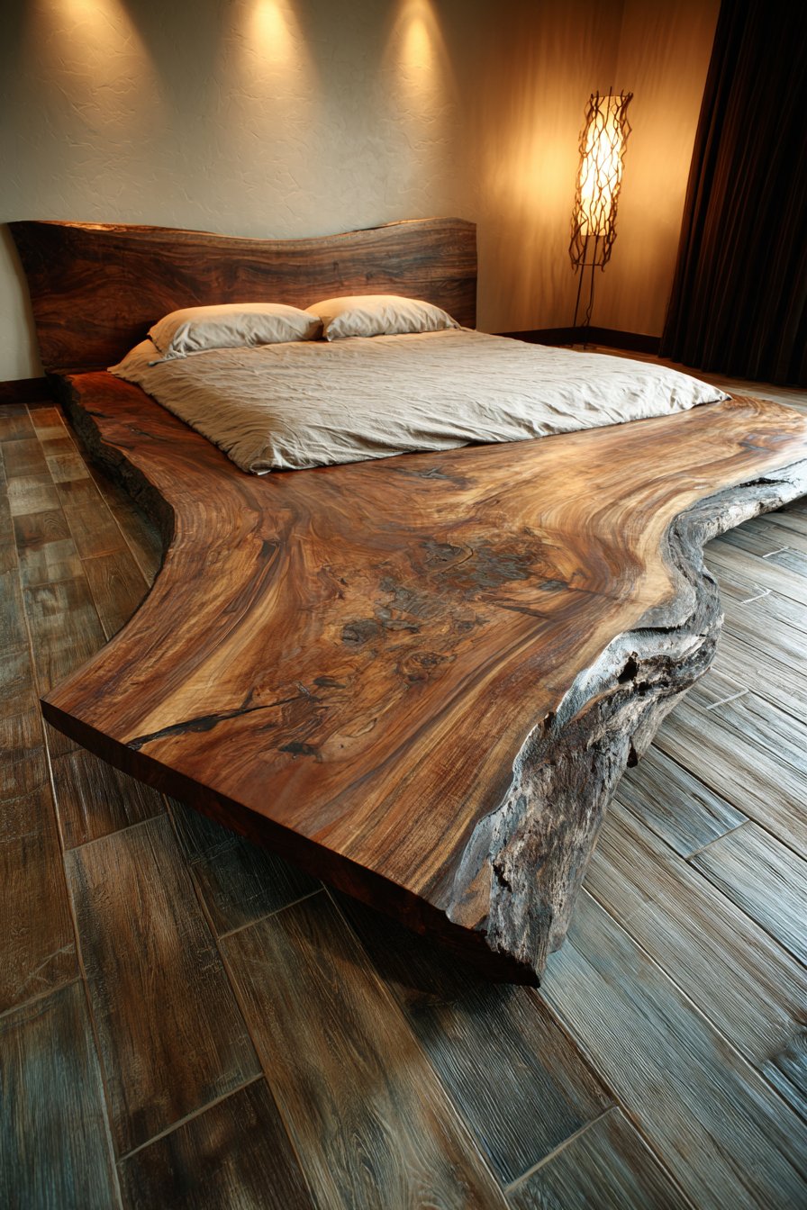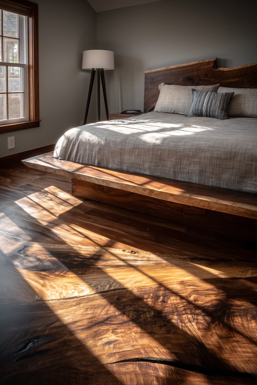 Celebrate natural artistry with this cozy low-bed bedroom idea featuring a custom low platform bed with live-edge walnut slab headboard showcasing natural wood grain and organic edge. The contemporary platform base sits six inches from wide-plank oak flooring, providing stable foundation that allows the dramatic live-edge headboard to command attention. Each live-edge slab is unique, with the natural contours, grain patterns, and character marks telling the story of the tree’s growth—no two pieces are identical, making this bedroom truly one-of-a-kind.