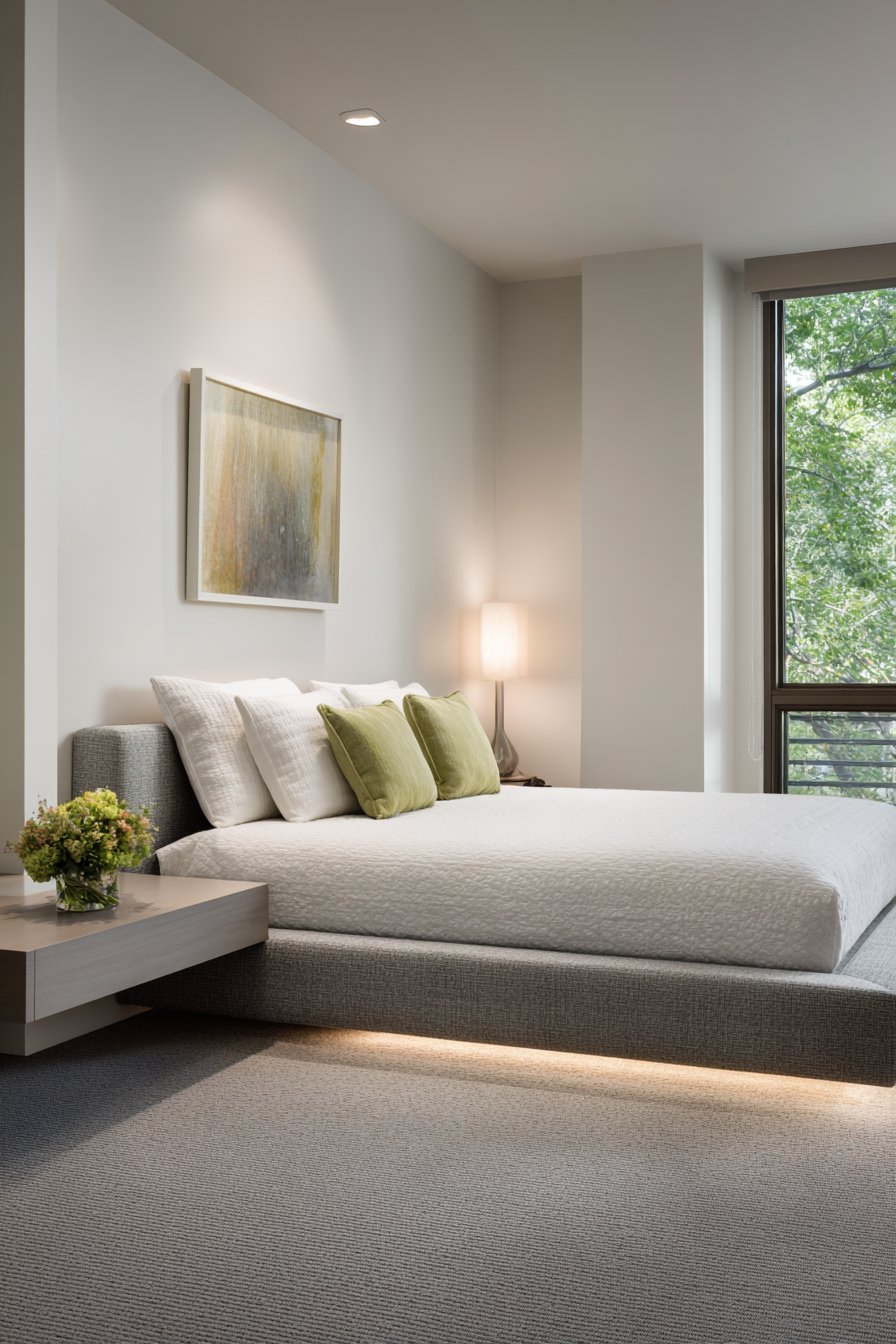 Lighting design in this cozy low-bed bedroom idea showcases contemporary approaches to ambiance creation. Recessed lighting provides ambient glow that can be dimmed to suit different times of day and activities, while a nearby window floods the space with soft diffused daylight that highlights the texture of the linen upholstery. A low-profile floating nightstand maintains the horizontal design aesthetic that’s essential to successful low-bed arrangements, ensuring that no piece of furniture disrupts the clean, grounded lines that make this style so visually appealing.