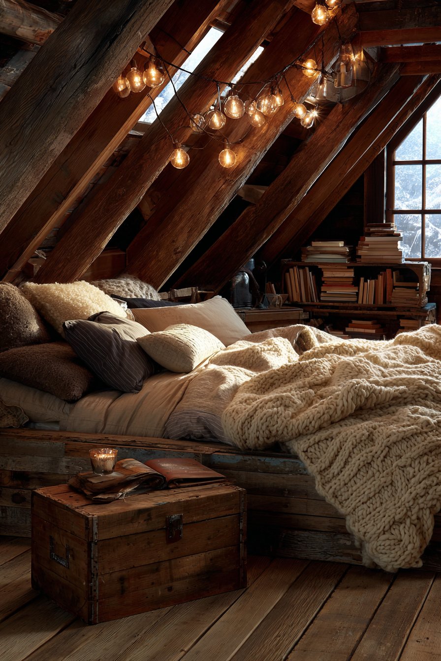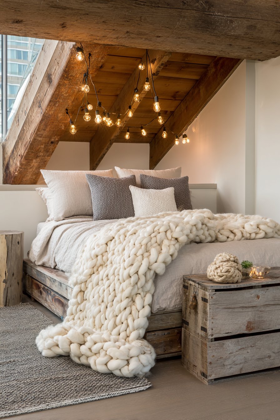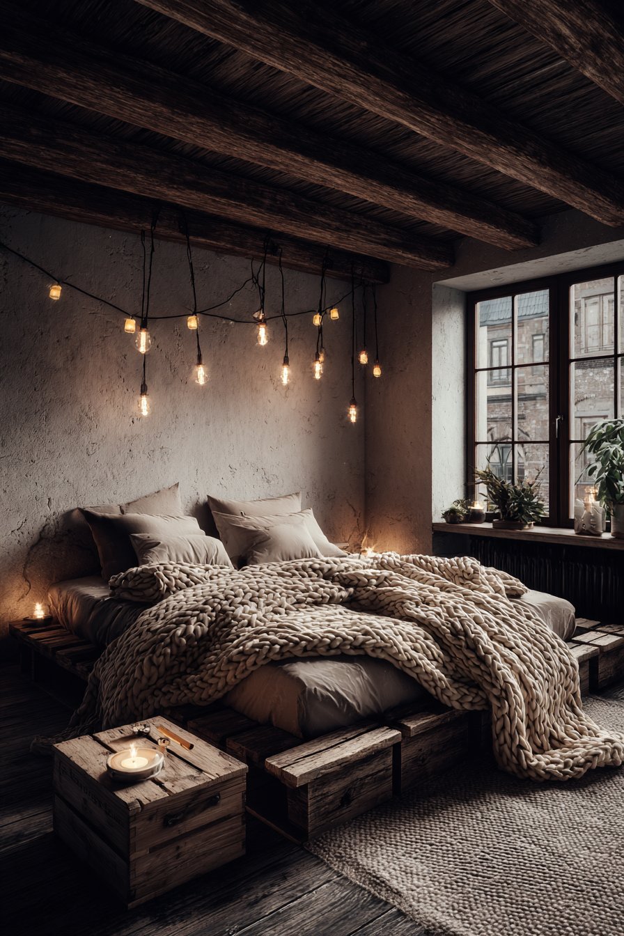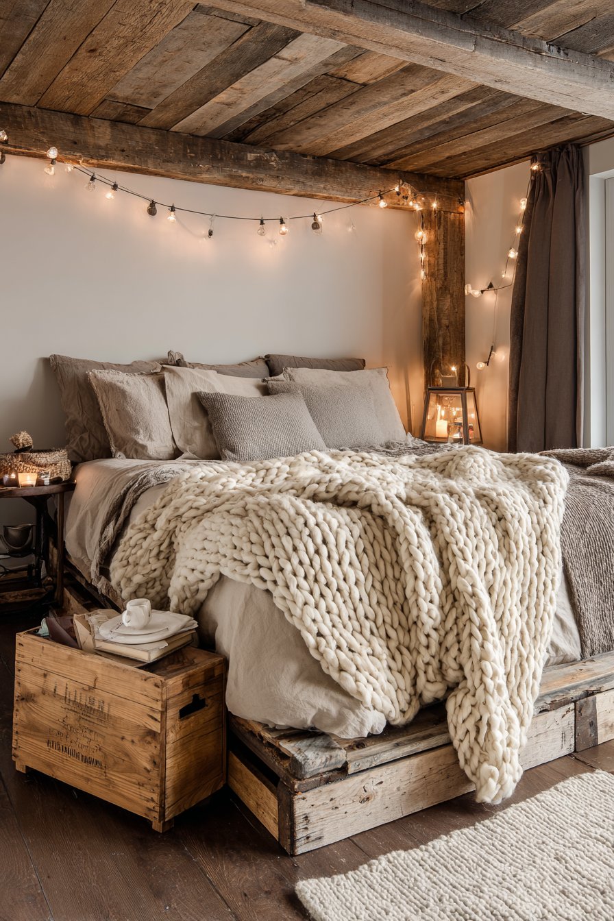 Architectural elements and lighting complete this cozy low-bed bedroom idea with authentic rustic charm. Exposed wooden beams overhead echo the material of the bed frame, creating vertical-horizontal dialogue that gives the space architectural cohesion. Edison bulb string lights cast warm amber glow that enhances the honey tones in the wood while creating intimate pockets of illumination. Morning sunlight streaming through windows creates natural highlights that dance across the textured wood surface, revealing new details throughout the day. A vintage wooden crate serving as a low bedside table maintains the reclaimed aesthetic while providing functional storage.
