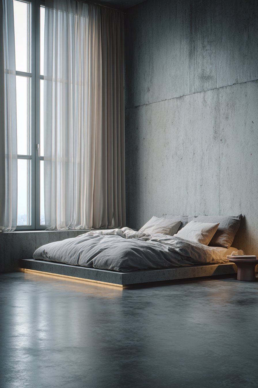 The stark minimalism of concrete requires careful balancing with softer elements to create true coziness. Soft white Belgian linen bedding with visible weave texture provides essential comfort contrast, its organic fibers and subtle imperfections humanizing the industrial foundation. The choice of pristine white creates maximum contrast against the grey concrete, ensuring the sleeping surface feels inviting rather than cold. Floor-to-ceiling sheer curtains diffuse natural light beautifully, softening the hard edges of the concrete while maintaining the room’s connection to the outside world.
