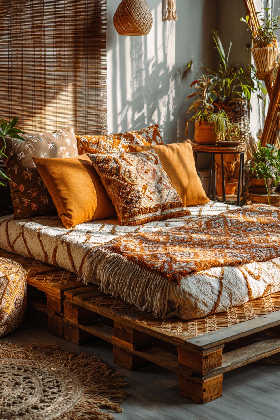 The magic of this design lies in its fearless layering of textiles and patterns. Kilim pillows in geometric patterns bring color and cultural richness, while macramé throw blankets in warm terracotta and cream tones add texture and artisanal charm. This cozy low-bed bedroom idea demonstrates that “more is more” can work beautifully when united by a cohesive color palette and commitment to natural materials. Each textile tells its own story, whether it’s a vintage kilim rug, a hand-knotted throw, or embroidered cushion covers that add personality without pretense.