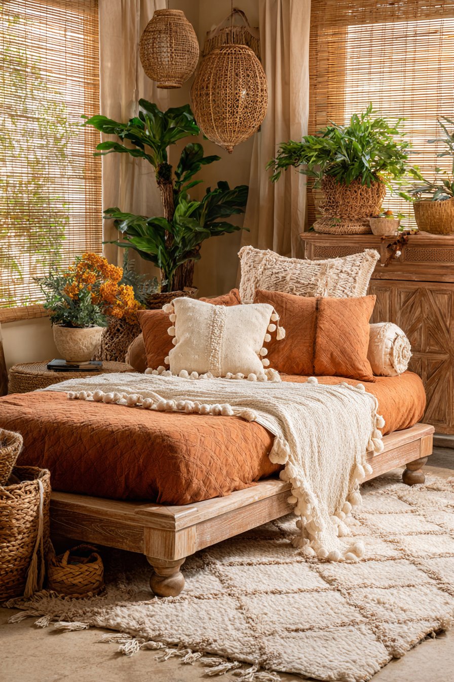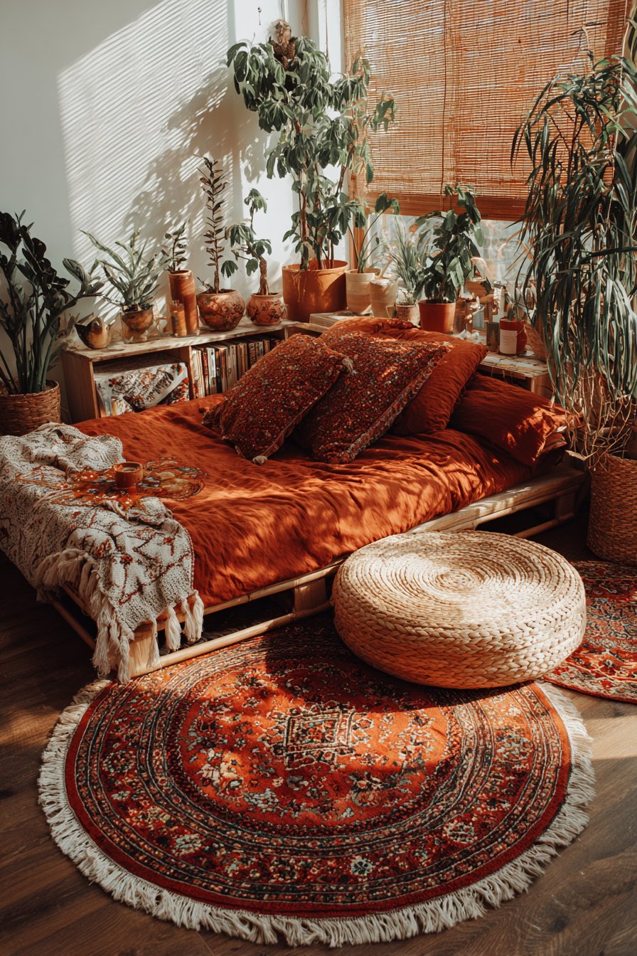 Plants transform this bedroom from simply decorated to truly alive. Potted greenery in varying heights surrounds the sleeping area, creating an organic sanctuary that improves air quality while adding vibrant life to the space. Natural lighting through bamboo shades creates dappled shadows that dance across the layered textiles, adding movement and connection to the outdoors. The overall effect is a cozy low-bed bedroom idea that feels like a personal retreat—eclectic, grounded, and deeply comfortable.