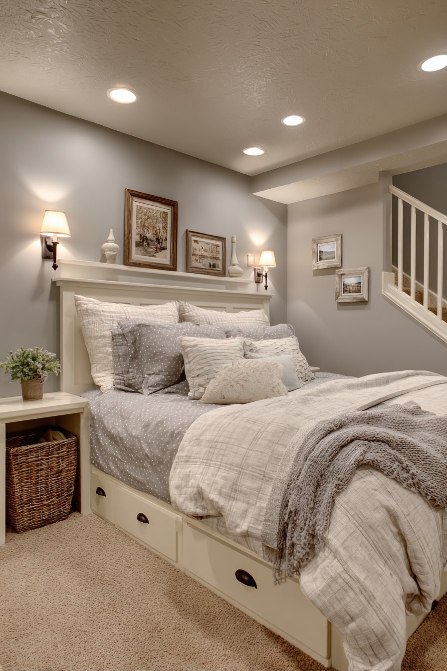 The supporting design elements maintain the emphasis on clean, functional beauty. Neutral bedding in soft grey and white creates a calming palette that doesn’t compete with the beautiful wood grain, allowing the craftsmanship of the platform to shine. Recessed ceiling lights and bedside wall sconces provide layered lighting that can be adjusted for different activities, from reading in bed to preparing for sleep. The overall composition proves that cozy low-bed bedroom ideas can be both beautiful and practical, offering solutions for real-world living without compromising design integrity.