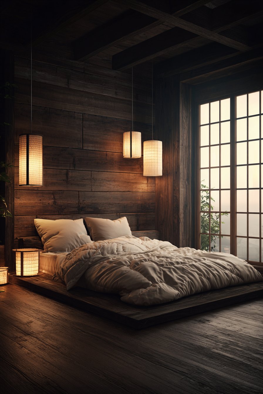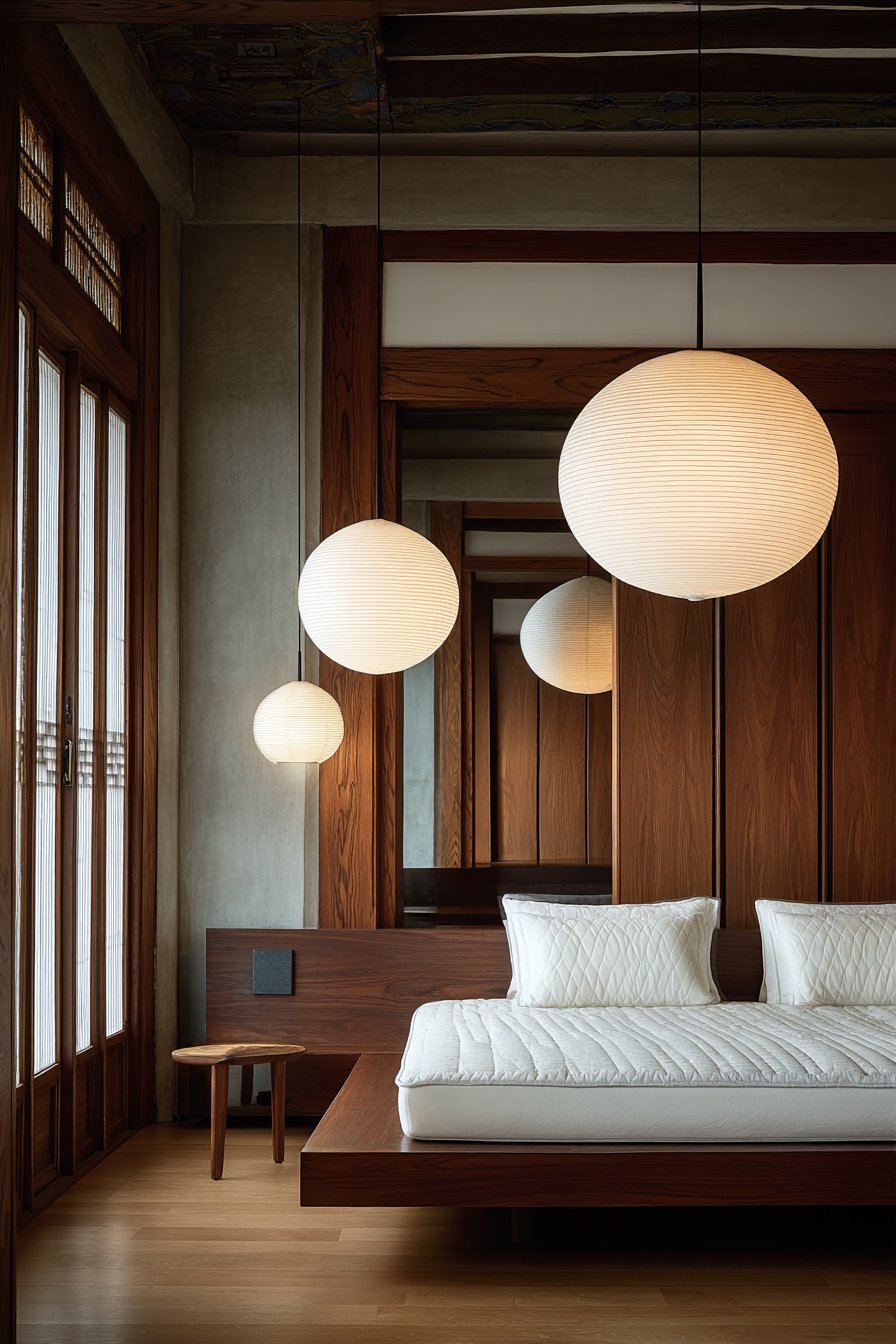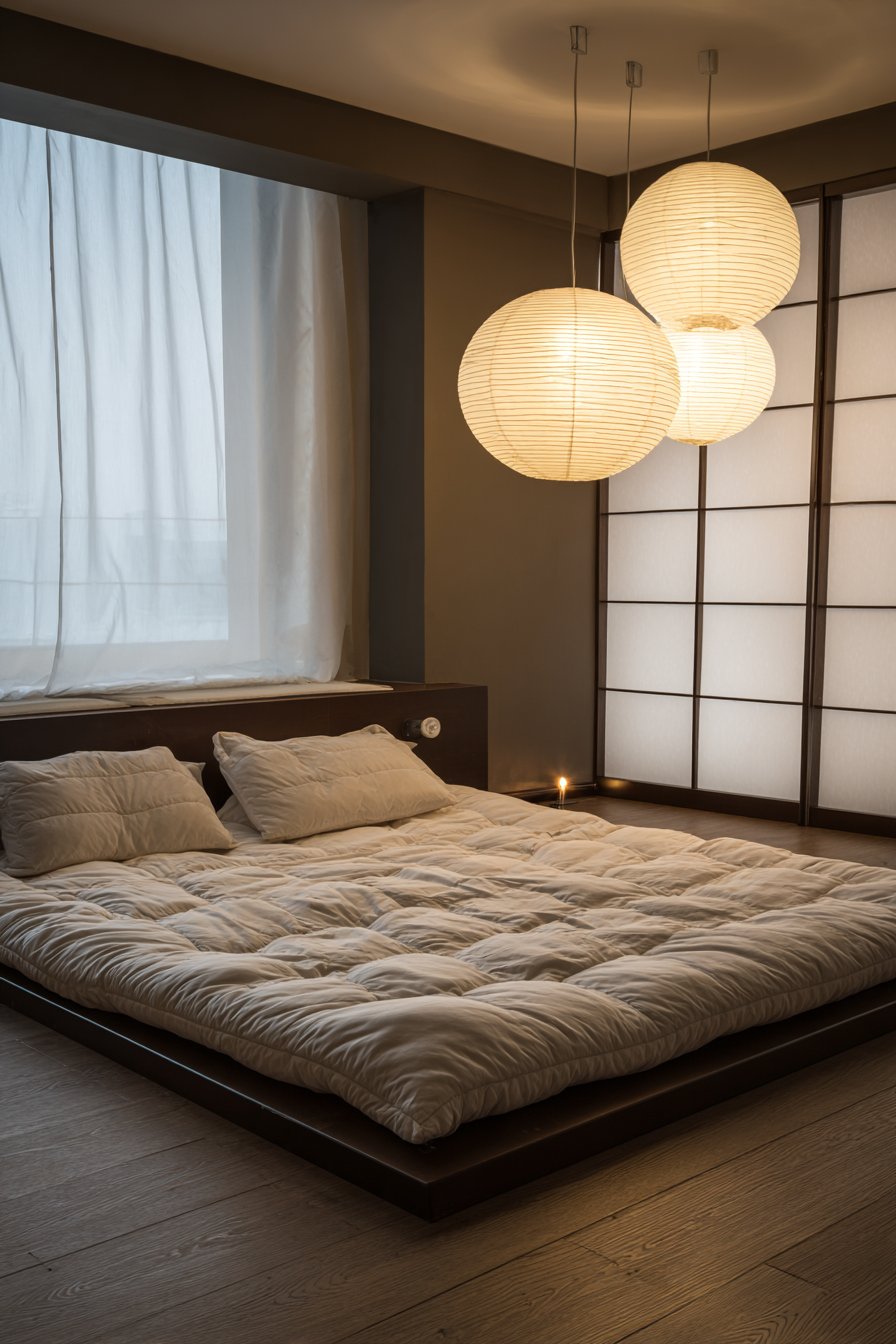 Lighting and architectural elements complete the cultural narrative. Paper lantern pendant lights provide soft ambient glow that honors Asian design traditions while creating functional illumination. Natural light filters through sliding shoji screens, creating gentle, diffused light that changes throughout the day, connecting inhabitants to natural rhythms. The screens also provide flexible space division, allowing the bedroom to feel more private or more open depending on their position. This cozy low-bed bedroom idea offers a meditation on simplicity, tradition, and the profound peace that comes from connecting with time-tested design wisdom.