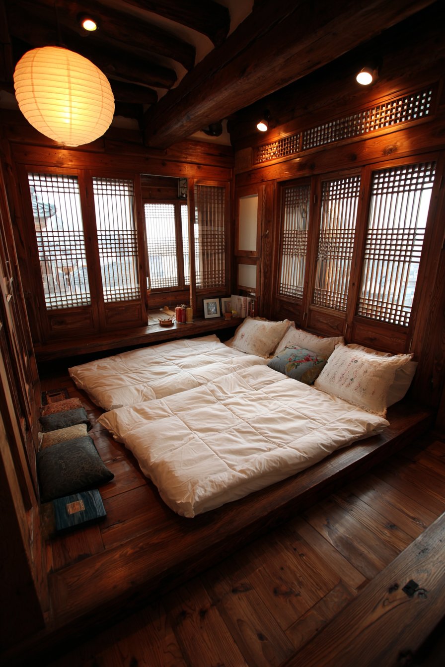 The bedding approach honors traditional Korean aesthetics while adapting to contemporary comfort expectations. Minimalist white cotton bedding with subtle quilting creates textural interest without pattern distraction, allowing the eye to rest and the mind to settle. This cozy low-bed bedroom idea demonstrates how cultural authenticity and modern livability can coexist beautifully—the yo mattress can be rolled and stored during the day in traditional fashion, or left in place for Western-style convenience, adapting to individual preferences and lifestyle needs.