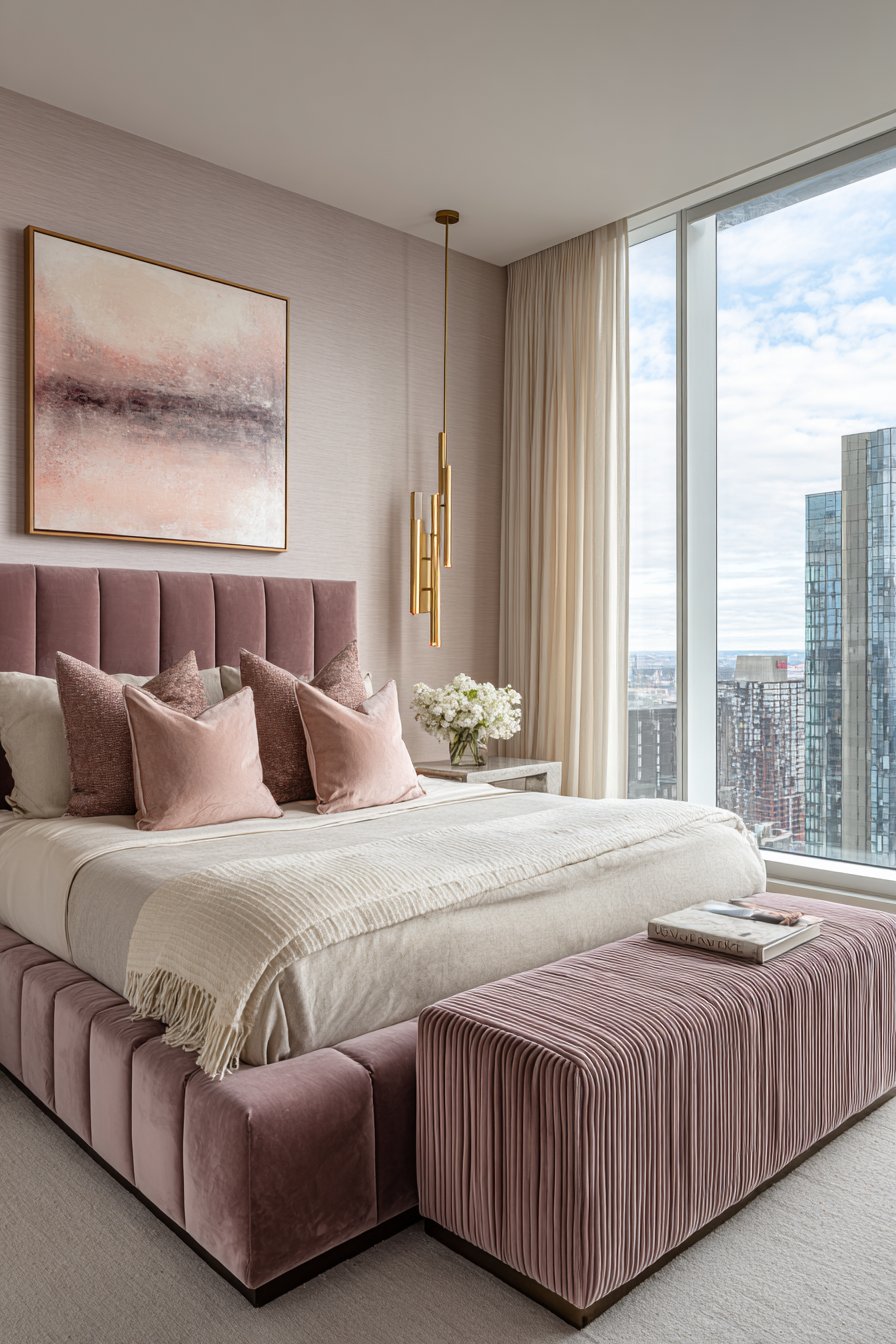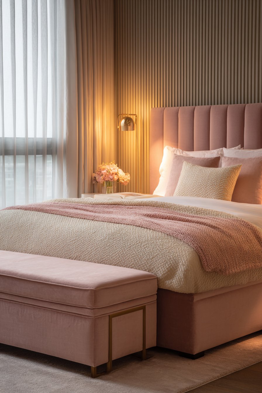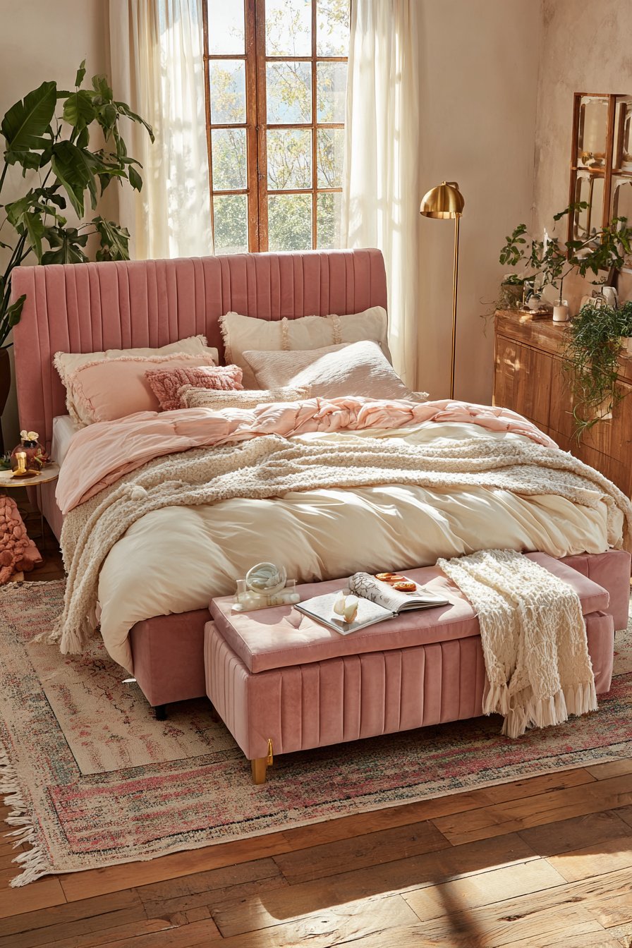 Lighting and accessories complete the romantic vision. A brass floor lamp introduces warm metallic accents that complement the dusty rose tones while providing adjustable task lighting for reading or working in bed. Sheer curtains filter golden hour sunlight, bathing the room in warm, flattering light that enhances the velvet’s luxurious appearance. A low-profile upholstered bench at the foot of the bed maintains the horizontal emphasis while providing practical seating and additional surface for folded blankets or decorative pillows. The overall effect is a cozy low-bed bedroom idea that feels like a personal sanctuary designed for rest, romance, and restoration.