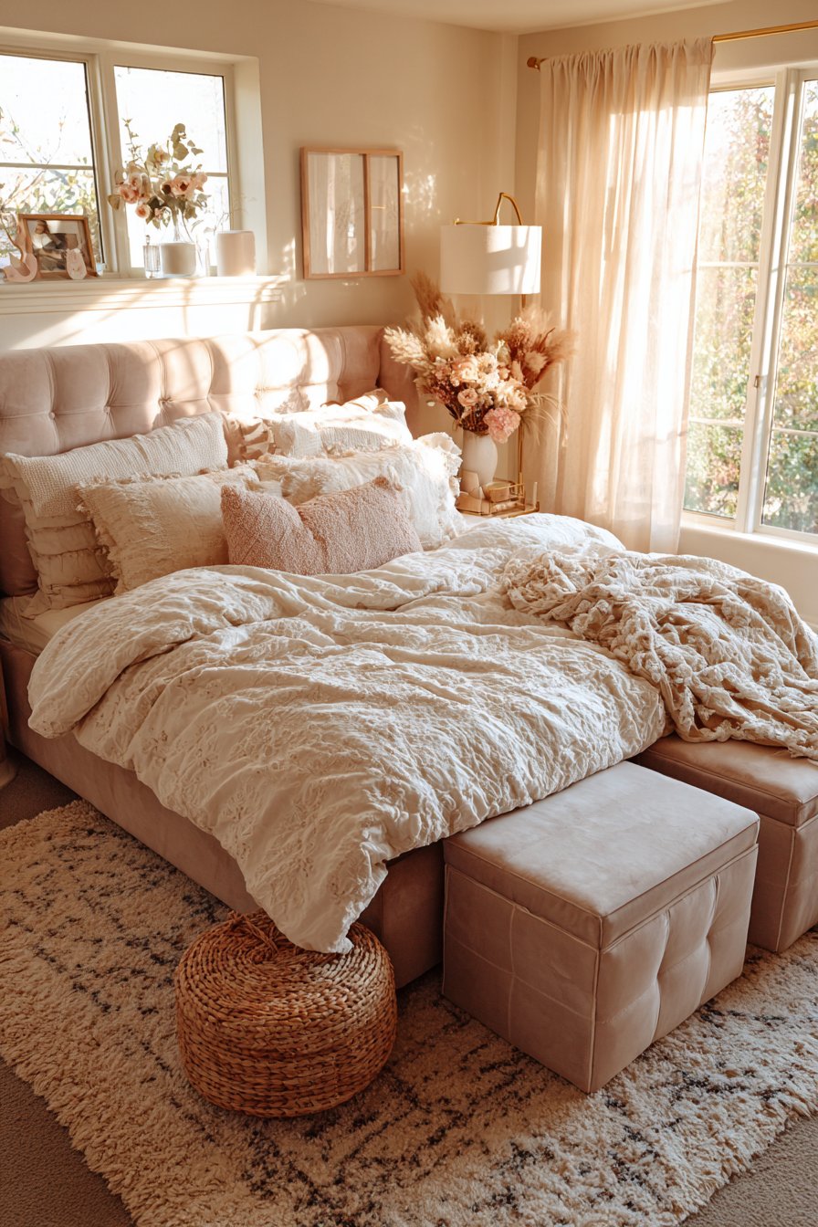The bedding composition enhances the romantic atmosphere through thoughtful color coordination. Layers of cream and blush bedding create tonal harmony with the dusty rose frame, building a cohesive scheme that feels intentional and polished. The subtle color variations prevent the monochromatic palette from feeling flat, instead creating depth through different textures—matte cotton, lustrous silk blends, and soft chenille each reflect light differently, adding visual complexity. This cozy low-bed bedroom idea demonstrates sophisticated color theory application, where restraint and tonal variation create more impact than bold contrasts.