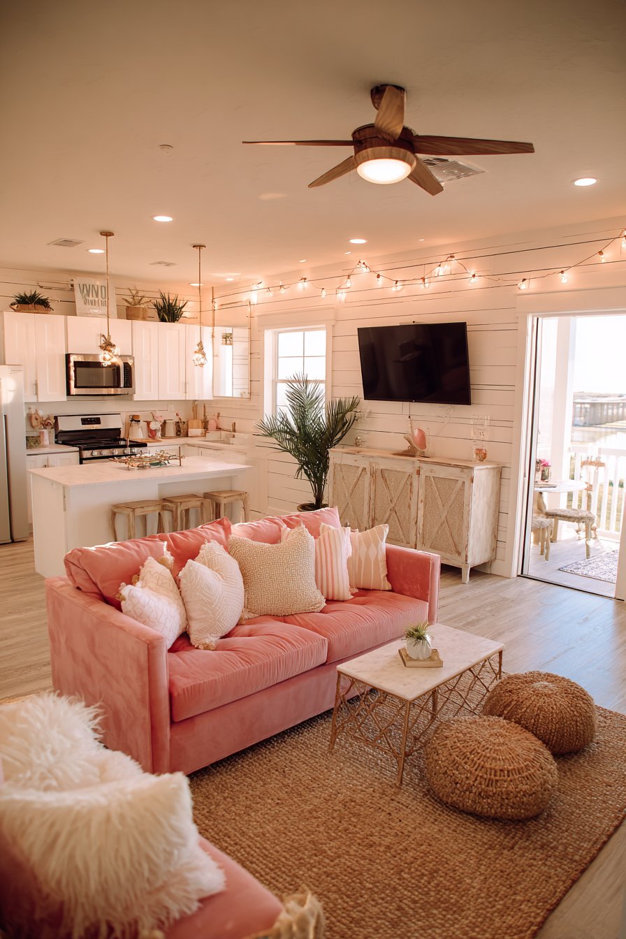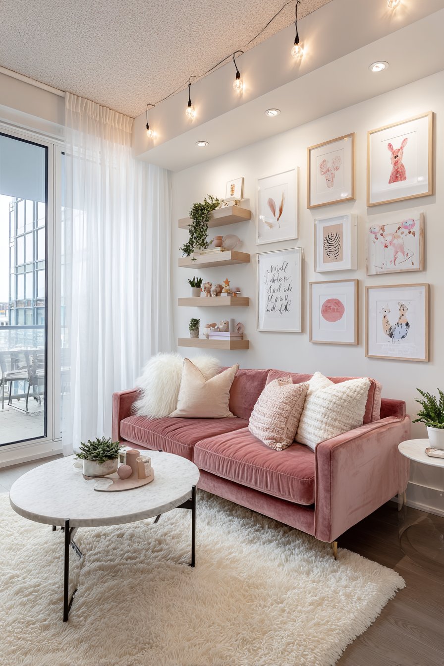 String lights draped across the ceiling create a magical ambient glow that transforms the space in evening hours, their warm light enhancing the romantic atmosphere and providing soft illumination that’s more flattering and intimate than overhead fixtures. The wide-angle photography captures this feminine yet functional space with balanced exposure that highlights the romantic color palette—soft pinks, warm whites, and natural tones—alongside the various textures from plush velvet to smooth marble to woven fiber. This design proves that romantic aesthetics can coexist beautifully with practical apartment living.