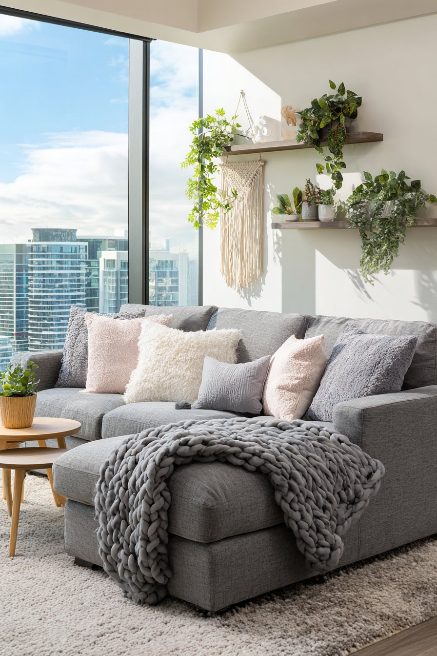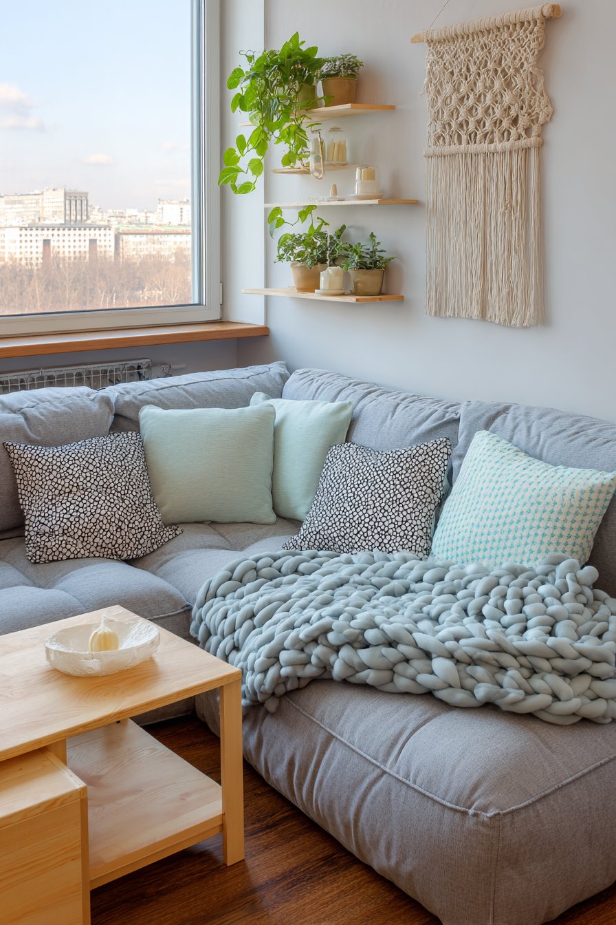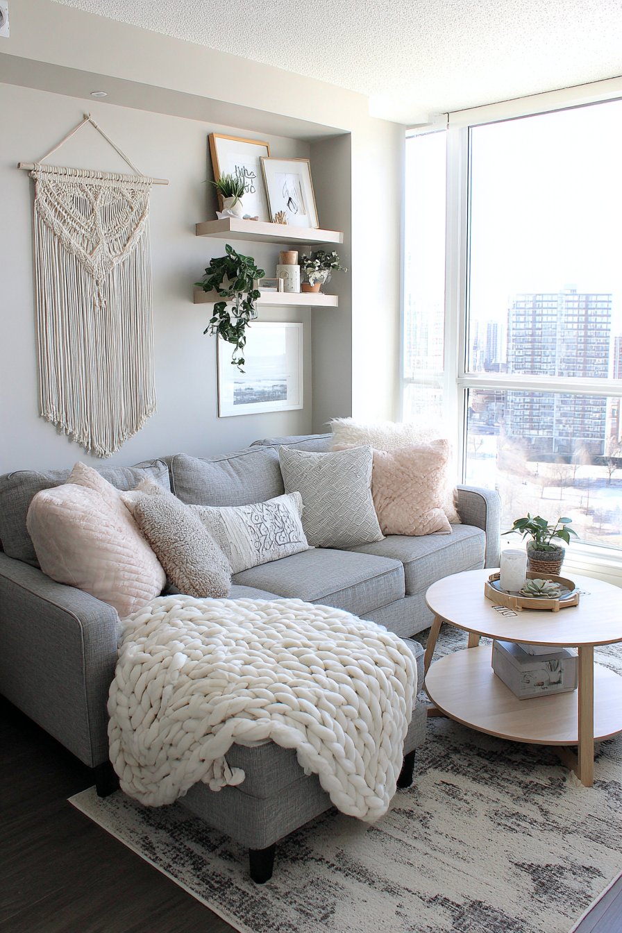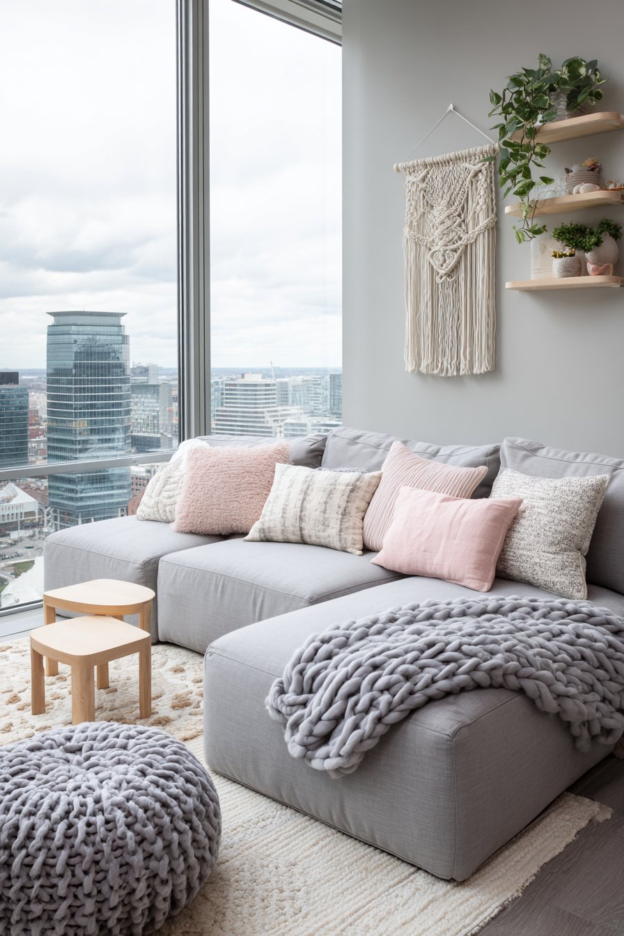 The foundation of this charming apartment living room centers around a thoughtfully sized sectional sofa in soft grey fabric, proving that comfort and style can coexist even in limited square footage. The sectional’s compact proportions ensure it doesn’t overwhelm the room while still providing ample seating for relaxing or entertaining. Draped across the cushions, oversized knit throw blankets in cream and oatmeal tones invite you to curl up with a good book, while an array of patterned cushions in pastel shades—think dusty rose, sage green, and powder blue—add visual interest without creating visual chaos.