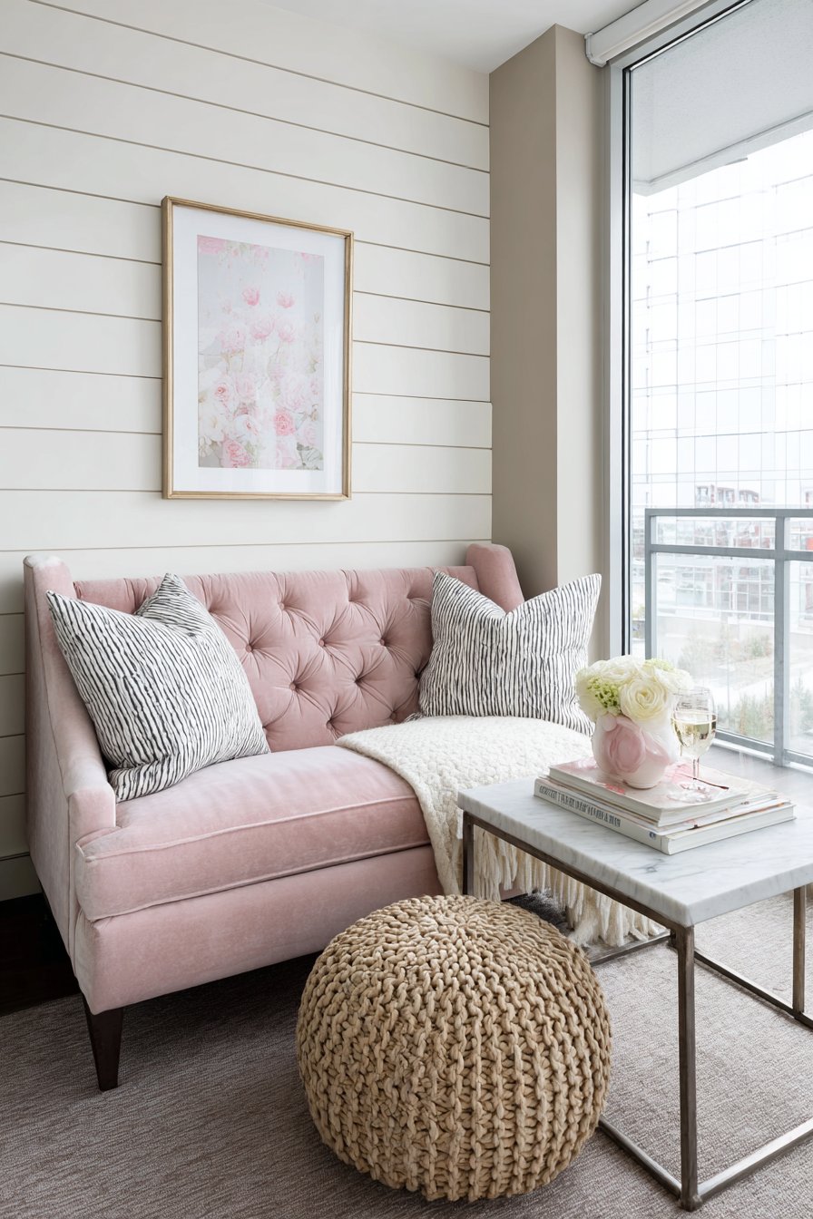 This feminine and romantic living room design centers on a tufted loveseat in blush pink velvet, a piece so beautiful it becomes the room’s jewelry—luxurious, eye-catching, and utterly enchanting. The velvet’s soft pile and subtle sheen create depth and visual interest while the button tufting adds traditional elegance that feels both classic and current. Positioned against a shiplap accent wall painted in soft white, the contrast highlights the loveseat’s gorgeous color while the shiplap’s horizontal lines create the illusion of a wider room.