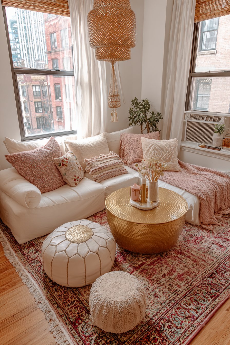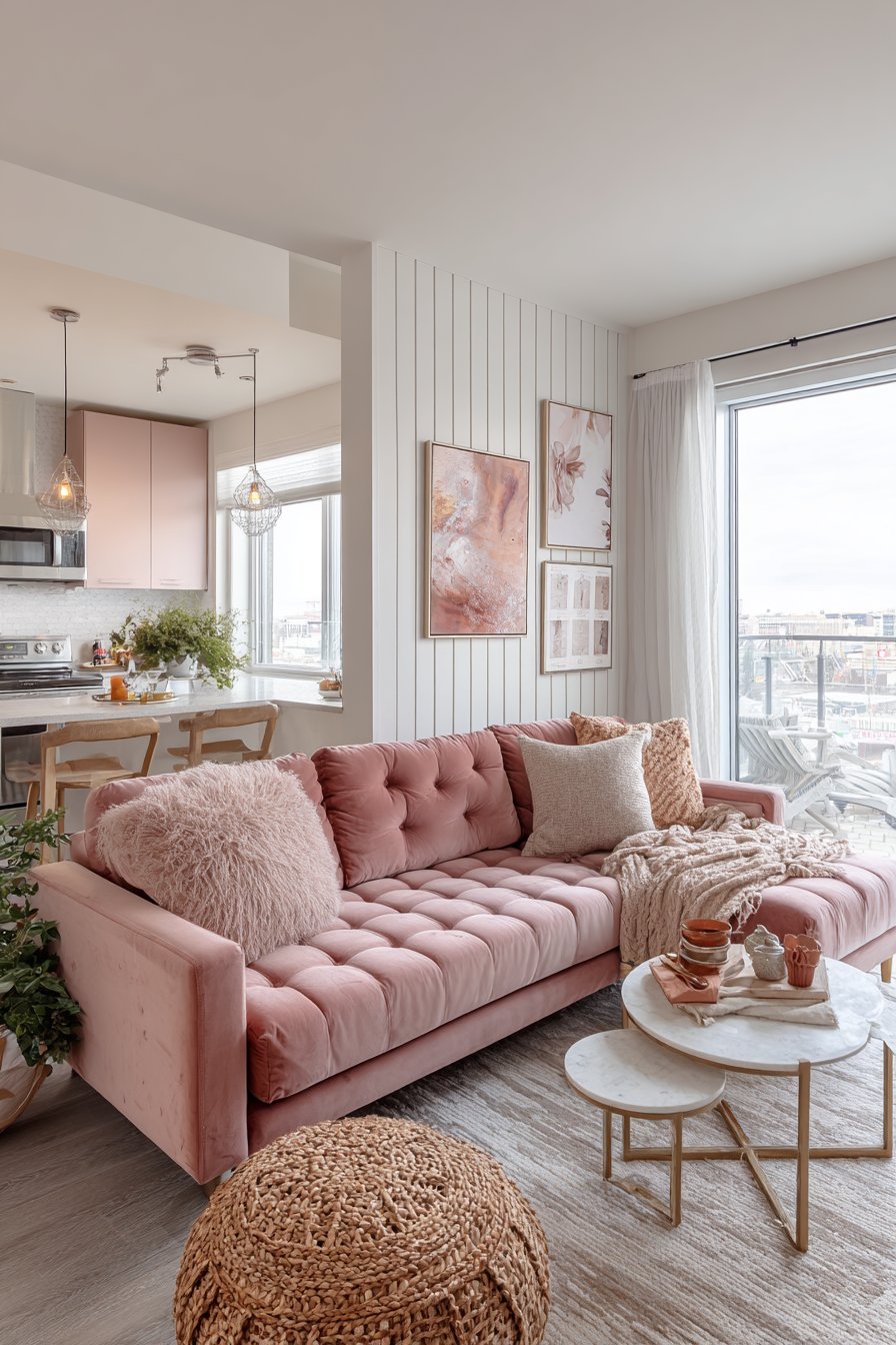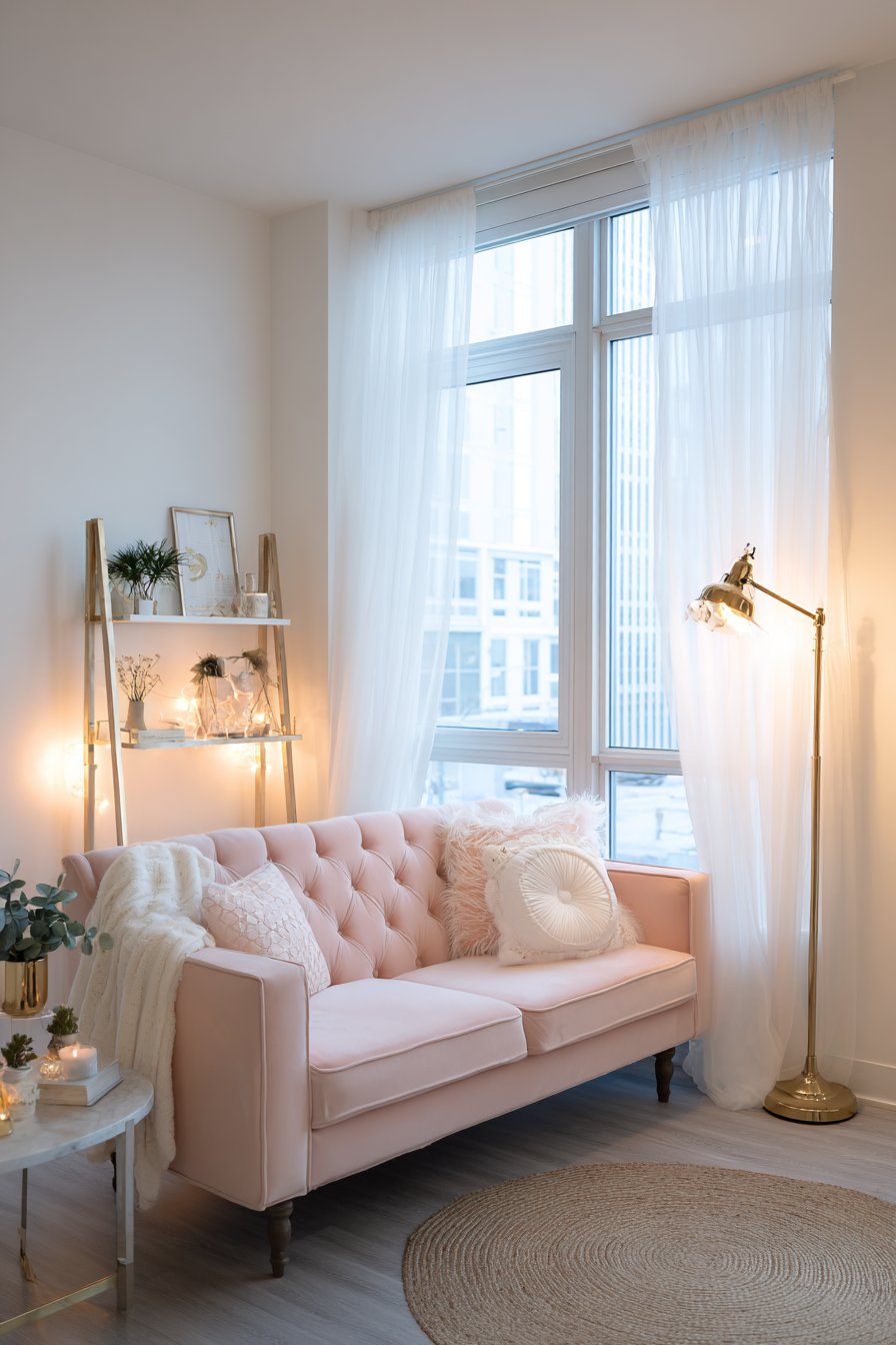 Sheer white curtains diffuse natural light beautifully, creating a soft, dreamy glow that enhances the room’s romantic atmosphere while maintaining privacy. The professional interior photography captures how balanced exposure can showcase the delicate color palette—from the blush pink of the loveseat to the warm beige of the jute to the brass accents that tie everything together. This approach to apartment living proves that you don’t need a large space to create a room that feels both sophisticated and utterly charming.