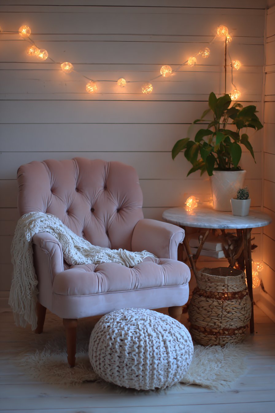 Fairy lights strung along the corner ceiling add a touch of whimsy and create ambient lighting for evening hours, their warm glow transforming the nook into a magical retreat when the sun sets. Natural lighting from the nearby window provides ideal reading conditions during daylight hours, while the professional interior photography captures how different textures—from the woven rattan of the papasan to the chunky knit throw to the smooth ceramic planters—work together to create a space that feels both intimate and inviting. This design proves that even in small apartments, carving out a dedicated relaxation zone can dramatically improve your quality of life.