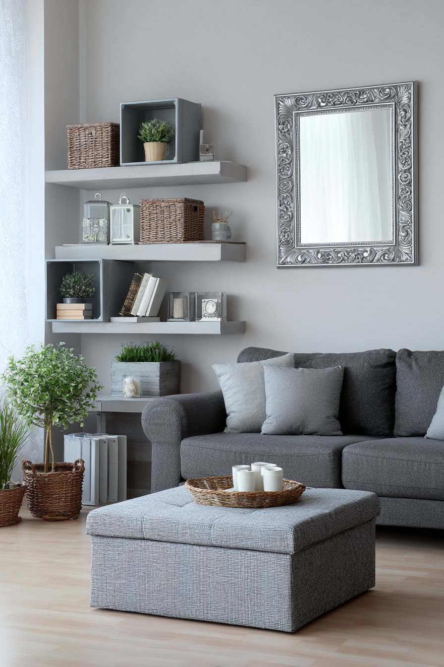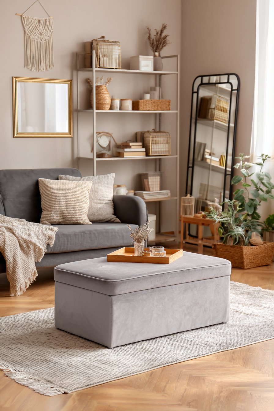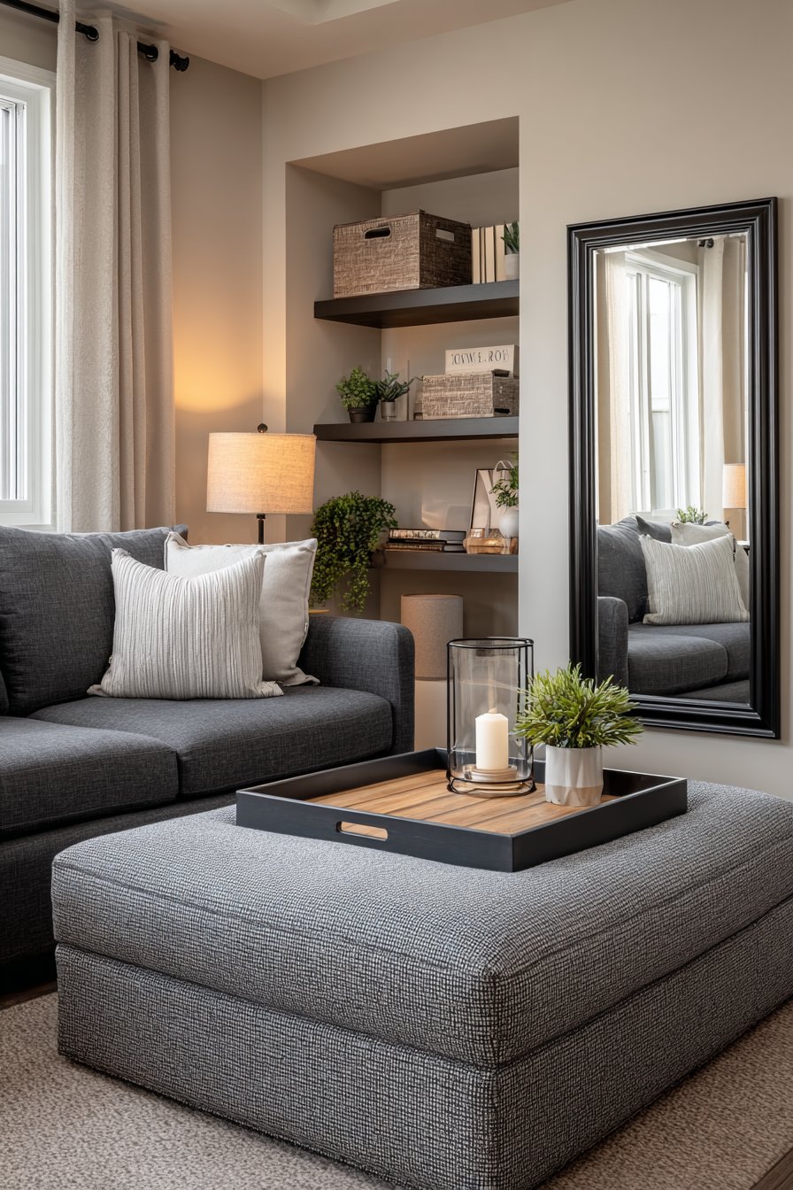 Key Design Tips: Choose storage ottomans that open easily for regular access; use serving trays on upholstered surfaces to create stable table areas; select apartment-sized furniture specifically designed for smaller spaces; install wall-mounted shelving to maximize vertical storage; use decorative boxes to conceal clutter while maintaining aesthetic appeal; lean large mirrors instead of hanging to avoid wall damage; incorporate charcoal and grey tones for sophistication and practicality; ensure every piece of furniture serves multiple functions; create designated homes for common items to maintain organization; mix open and closed storage for visual interest.