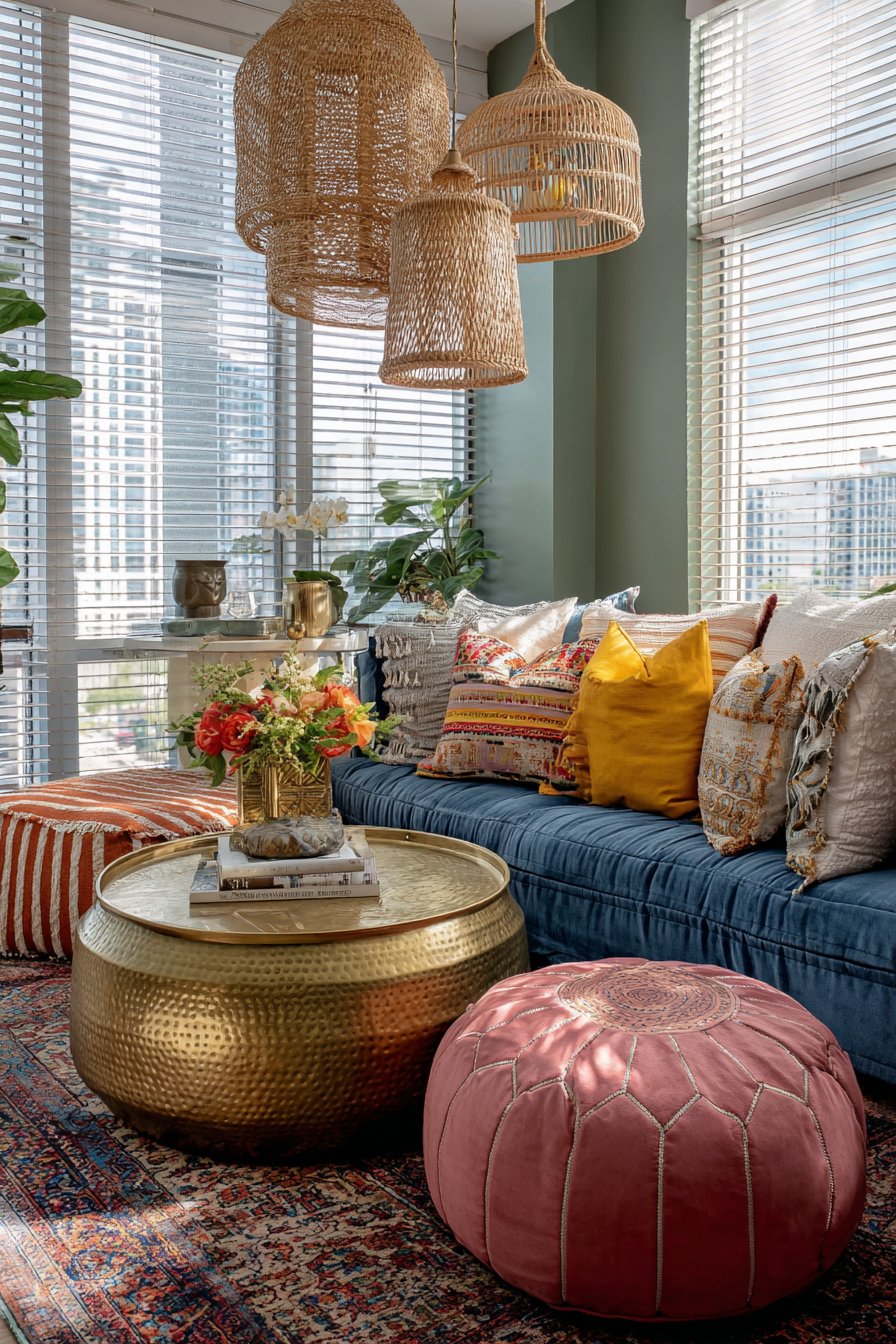 Hanging rattan pendant light fixtures add textural warmth and create a defined lighting zone over the seating area, their natural woven construction filtering light in beautiful patterns across the ceiling and walls. Natural daylight filters through bamboo blinds, creating striped shadow patterns that change throughout the day and connect the interior to the natural world outside. The interior design photography captures this eclectic yet cohesive layered look, showcasing how mixing patterns, textures, and cultural influences can create a living room that feels collected, personal, and utterly unique.