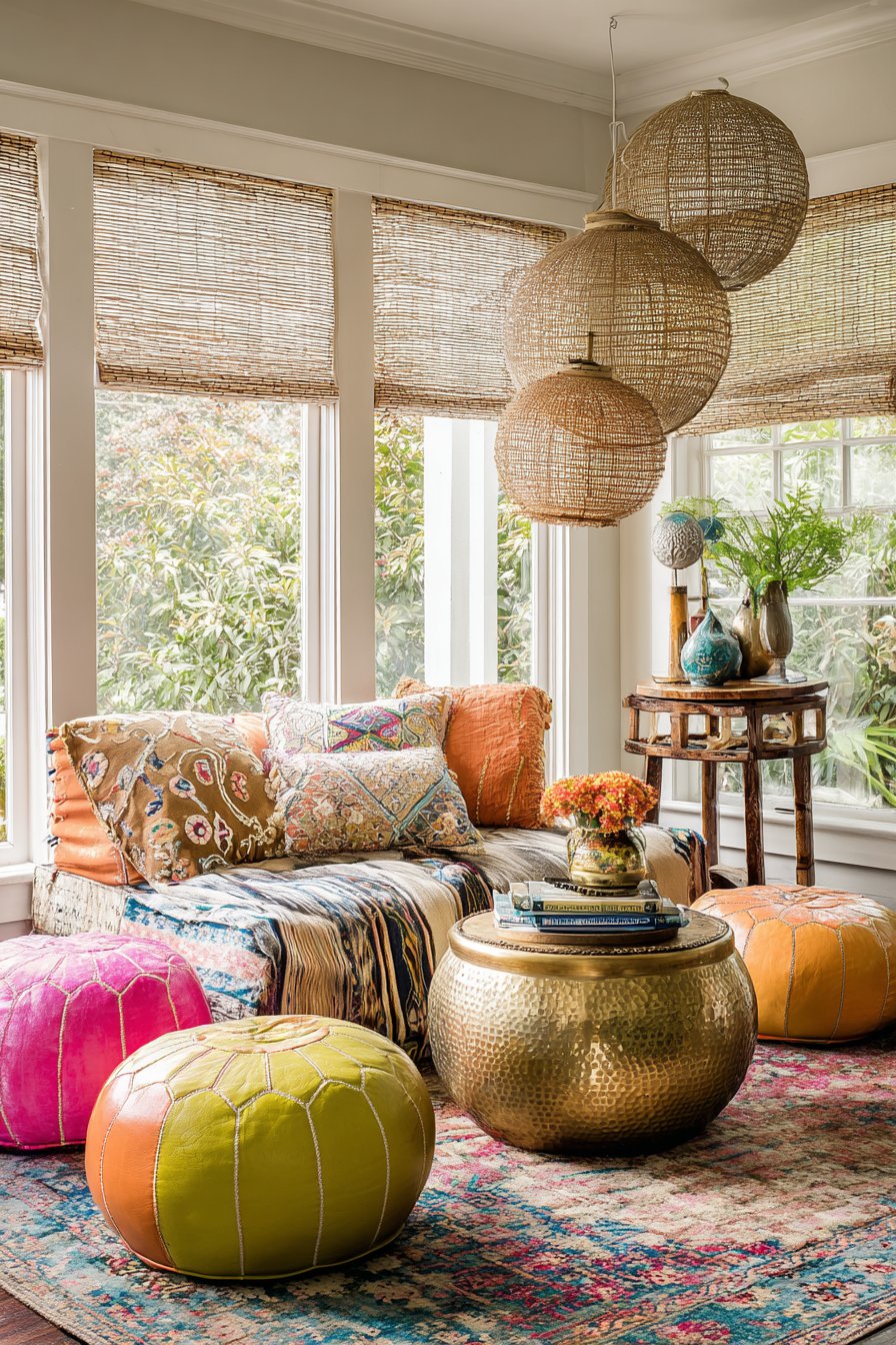 This eclectic living room embraces bohemian principles by creating a low-level lounge area that encourages relaxation and intimate conversation. The arrangement features oversized floor cushions in various patterns—think vintage kilim prints, embroidered mandalas, and block-printed florals—that can be rearranged easily to accommodate different numbers of guests or activities. A Moroccan-style leather pouf in rich cognac or natural tan serves as both additional seating and a small table, its authentic craftsmanship and traditional design adding worldly sophistication.