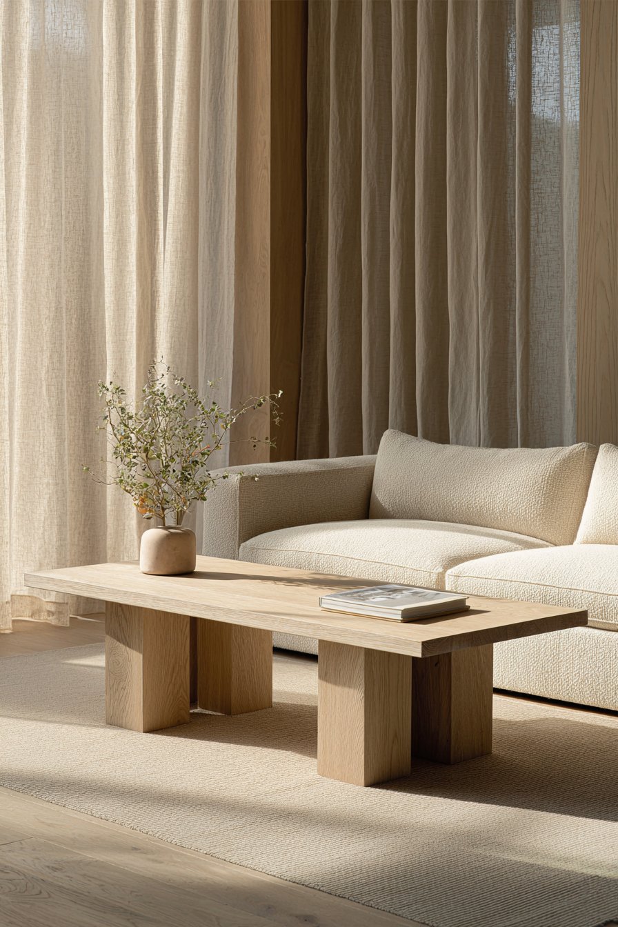 A simple rectangular coffee table in light oak continues the natural material theme, its honest wood grain and minimal form embodying the “form follows function” principle at minimalism’s core. There are no unnecessary decorative elements, no hidden compartments or complicated mechanisms—just a beautiful, well-crafted table that serves its purpose perfectly. A single statement plant in a simple ceramic planter—perhaps a sculptural monstera or dramatic snake plant—adds the only touch of life and color needed, its organic form providing contrast to the geometric furniture while improving air quality.