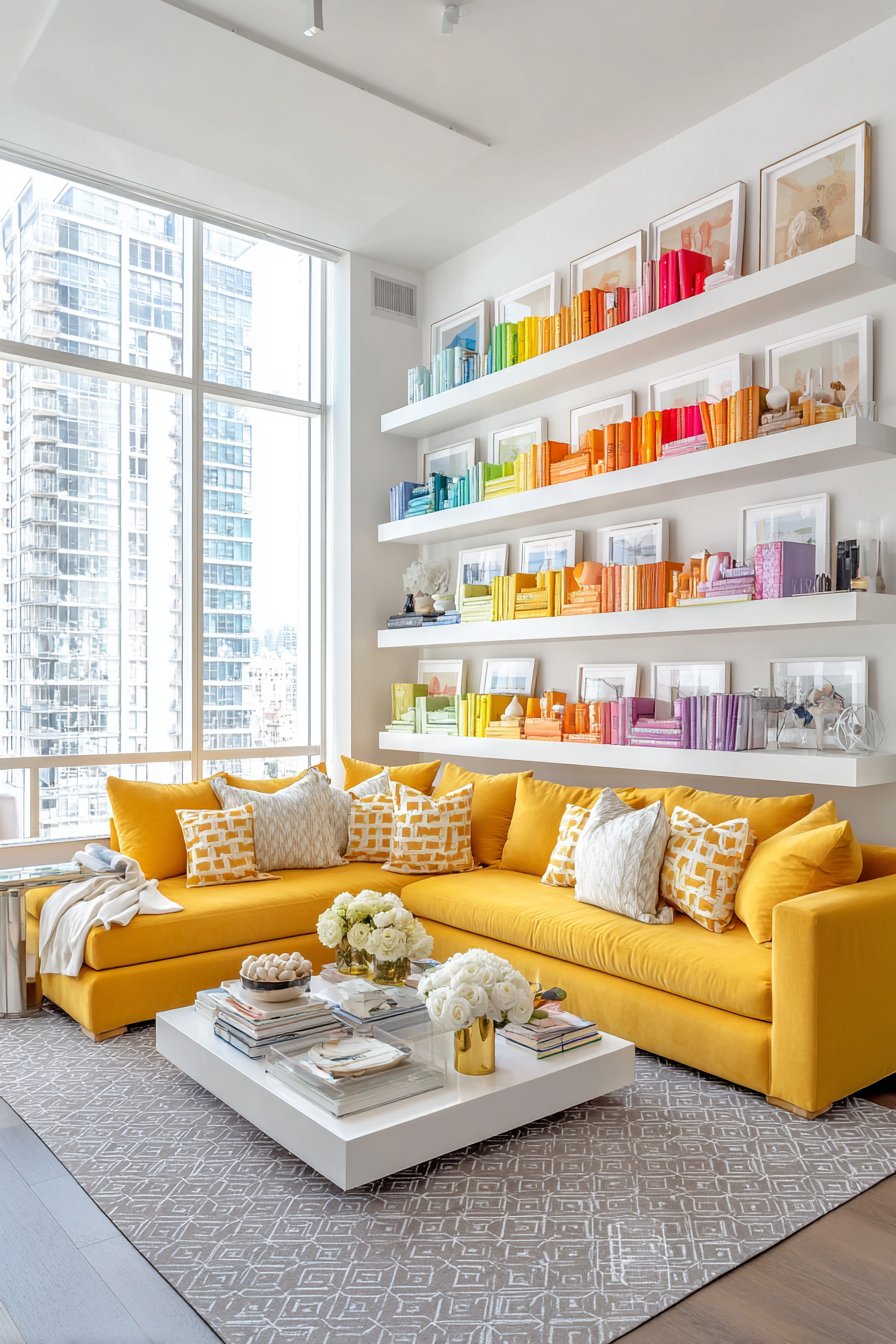 White floating shelves create a gallery wall system where colorful books are arranged by spine color, creating a rainbow effect that’s both visually striking and surprisingly calming in its organization. Interspersed among the books, small decorative objects—perhaps vintage cameras, ceramic animals, or travel souvenirs—add personal touches that tell your story. This curated approach to display turns functional book storage into an art installation that serves as the room’s secondary focal point.