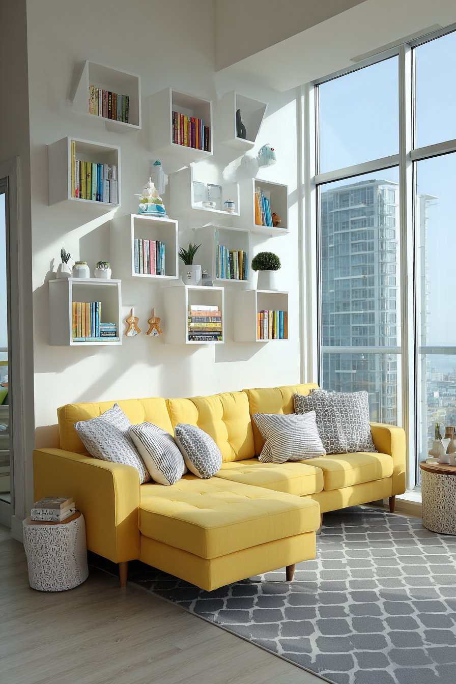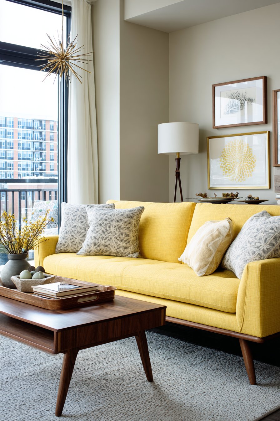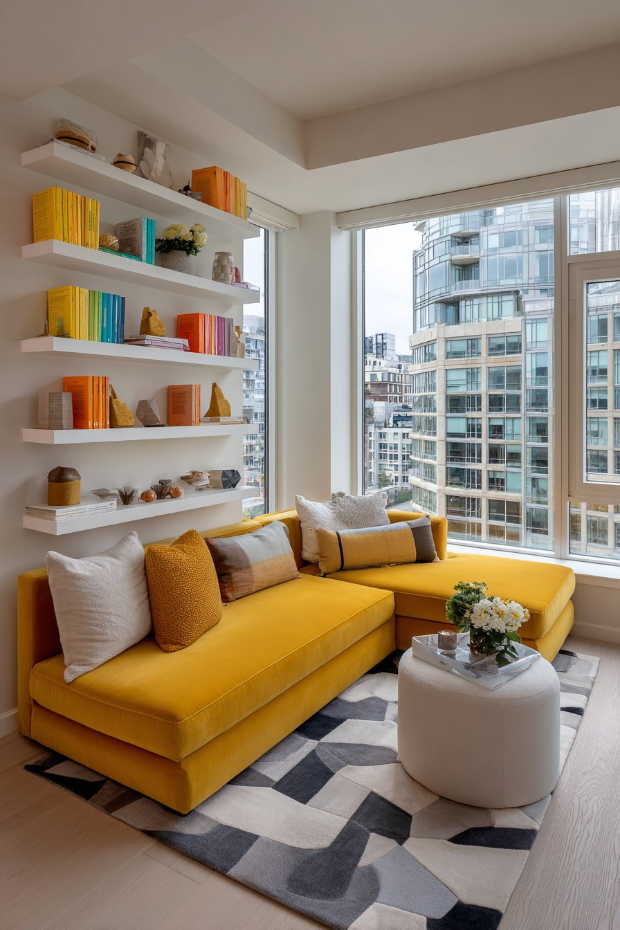 This energetic living room design demonstrates how a bold color choice can transform a neutral space into something truly memorable. The petite sectional in sunny yellow fabric serves as an instant mood-lifter, its cheerful hue bringing warmth and optimism that’s particularly valuable in apartments with limited natural light or urban views. Despite its vibrant color, the sectional’s compact scale ensures it enhances rather than overwhelms the room, proving that bold doesn’t have to mean large.