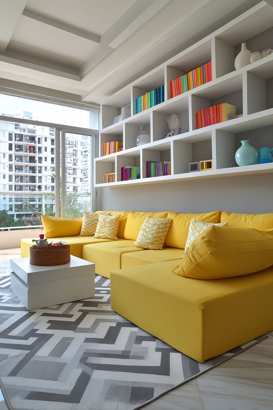 A geometric patterned rug in grey and white provides visual grounding for the vibrant yellow seating, its neutral palette ensuring the bold furniture remains the star while adding pattern and defining the living zone. Natural light from large windows illuminates the space beautifully, captured with professional interior photography that highlights the bold yet balanced color choices and youthful energy. This design is perfect for personalities who see their home as an expression of their optimistic, creative spirit and aren’t afraid to embrace color in unexpected ways.
