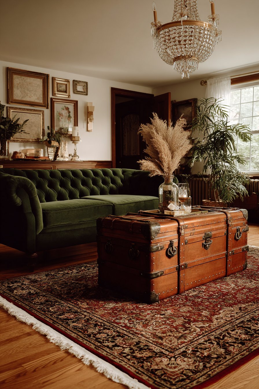 A refinished wooden trunk serving as a coffee table adds character and provides hidden storage—imagine vintage leather straps, brass corners, and a weathered patina that suggests stories of travels past. This piece grounds the room with its solid presence while offering practical storage for blankets, photo albums, or seasonal items. Antique brass picture frames in various sizes and styles create an eclectic gallery wall that showcases family photos, vintage botanical prints, or black and white photography, their golden tones echoing the trunk’s hardware.
