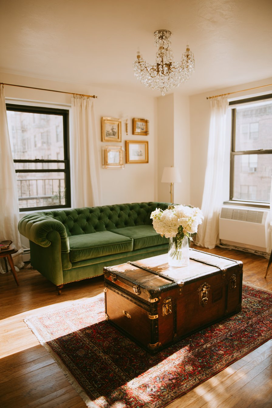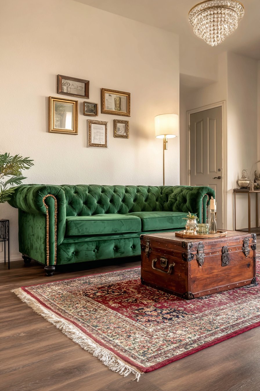 This sophisticated living room channels vintage elegance through carefully selected pieces that evoke old-world charm while remaining entirely functional for modern apartment living. The small velvet Chesterfield sofa in emerald green makes an immediate impact, its deep jewel tone and classic button tufting creating luxury and formality that’s balanced by its compact proportions. The emerald hue brings richness and depth while the velvet’s texture catches light beautifully, creating subtle variations in tone throughout the day.