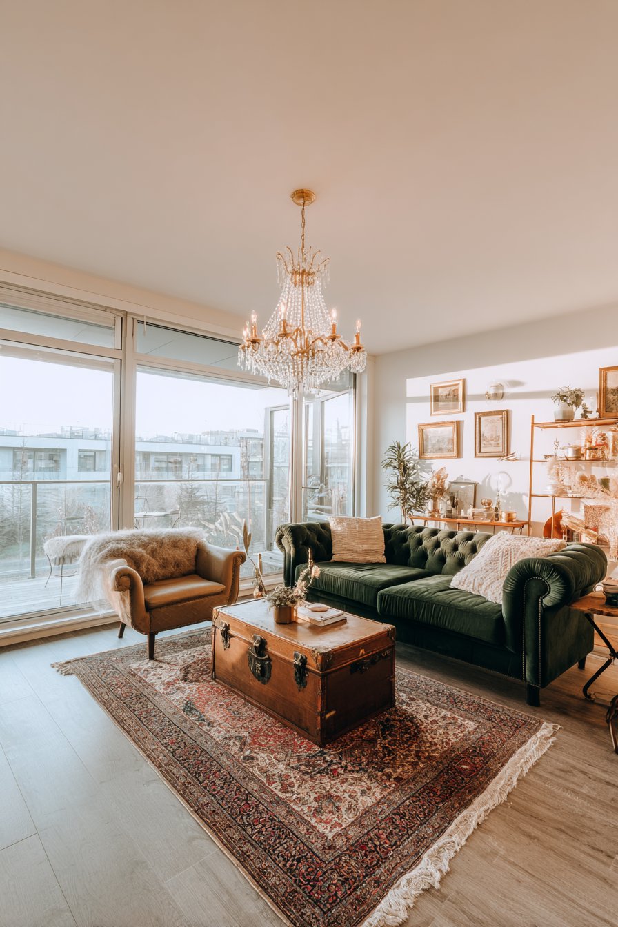 A crystal chandelier adds unexpected elegance overhead, its prismatic drops catching and scattering light in rainbow sparkles across the walls. This grand gesture elevates the entire space, proving that even rental apartments can accommodate glamorous lighting with proper installation or landlord permission. A Persian-style runner in rich tones—deep reds, navy blues, and golden yellows—warms the hardwood floor while adding pattern and traditional elegance. Interior design photography with warm natural lighting captures the collected-over-time aesthetic and sophisticated charm achievable even in compact quarters.