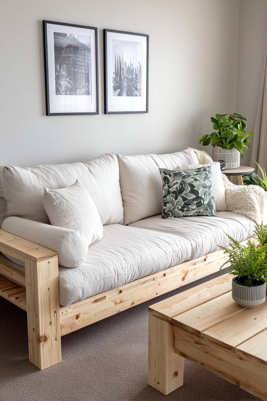 This warmly minimalist living room embodies the Danish concept of “hygge”—that untranslatable feeling of cozy contentment and well-being. The light wood frame sofa with removable linen covers in natural white creates the foundation, its simple construction and washable slipcovers balancing beauty with practicality. The exposed wood frame showcases beautiful birch grain while the linen’s relaxed drape and lived-in texture prevent the space from feeling too precious or untouchable.