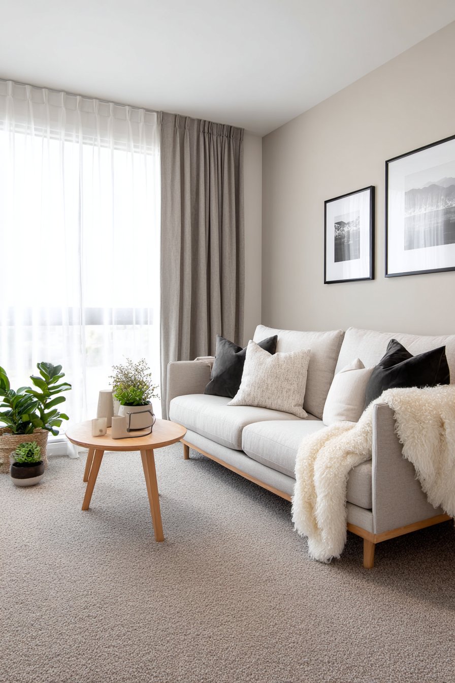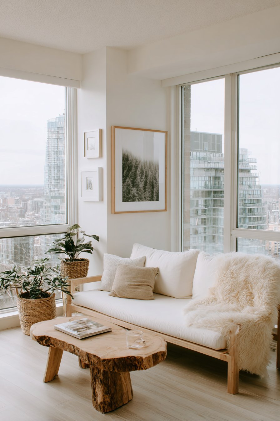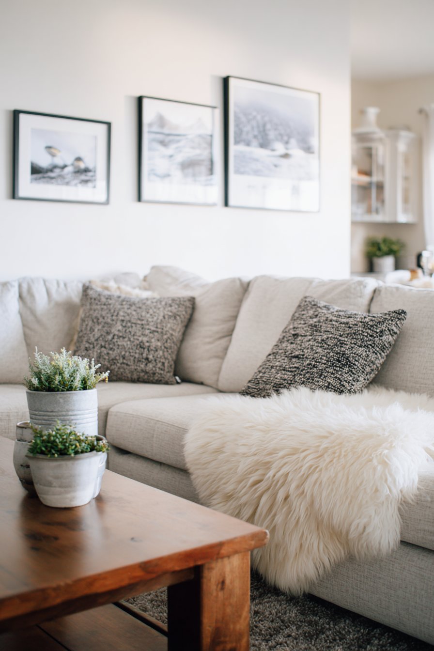 A simple birch coffee table continues the light wood theme, its clean lines and honest construction reflecting Scandinavian design values of functionality and natural materials. Draped casually over the sofa’s arm, a sheepskin throw adds luxurious textural warmth—its natural lanolin-rich fibers providing both visual softness and actual warmth for chilly evenings. Potted plants in simple ceramic planters in whites and greys bring controlled doses of green life, while black and white photography prints in simple wooden frames create a gallery wall with graphic impact that respects the minimal aesthetic.