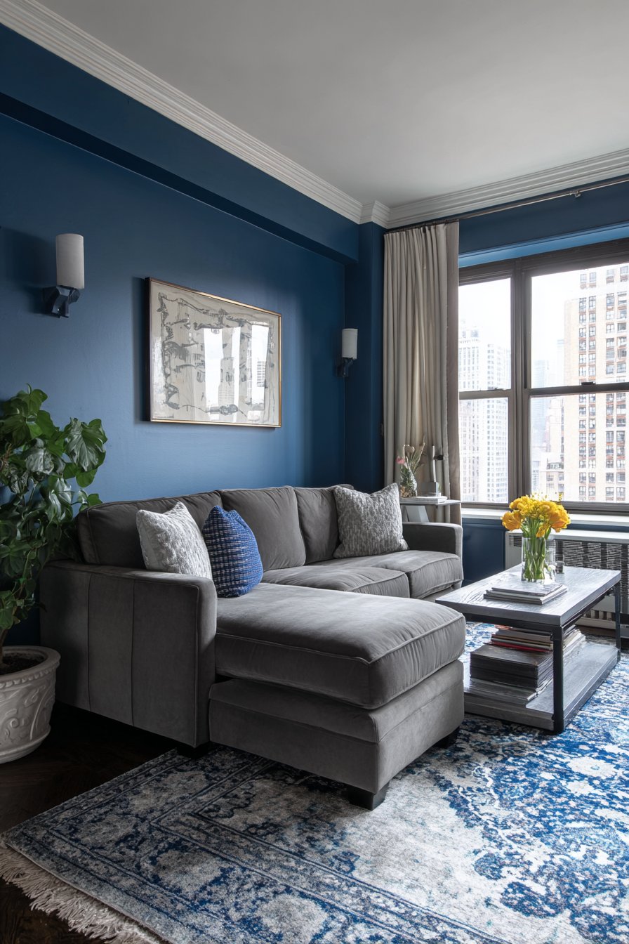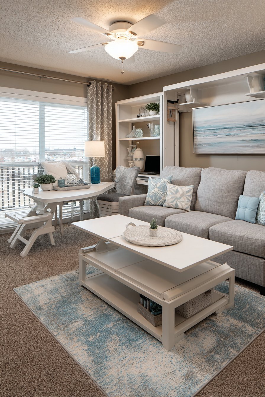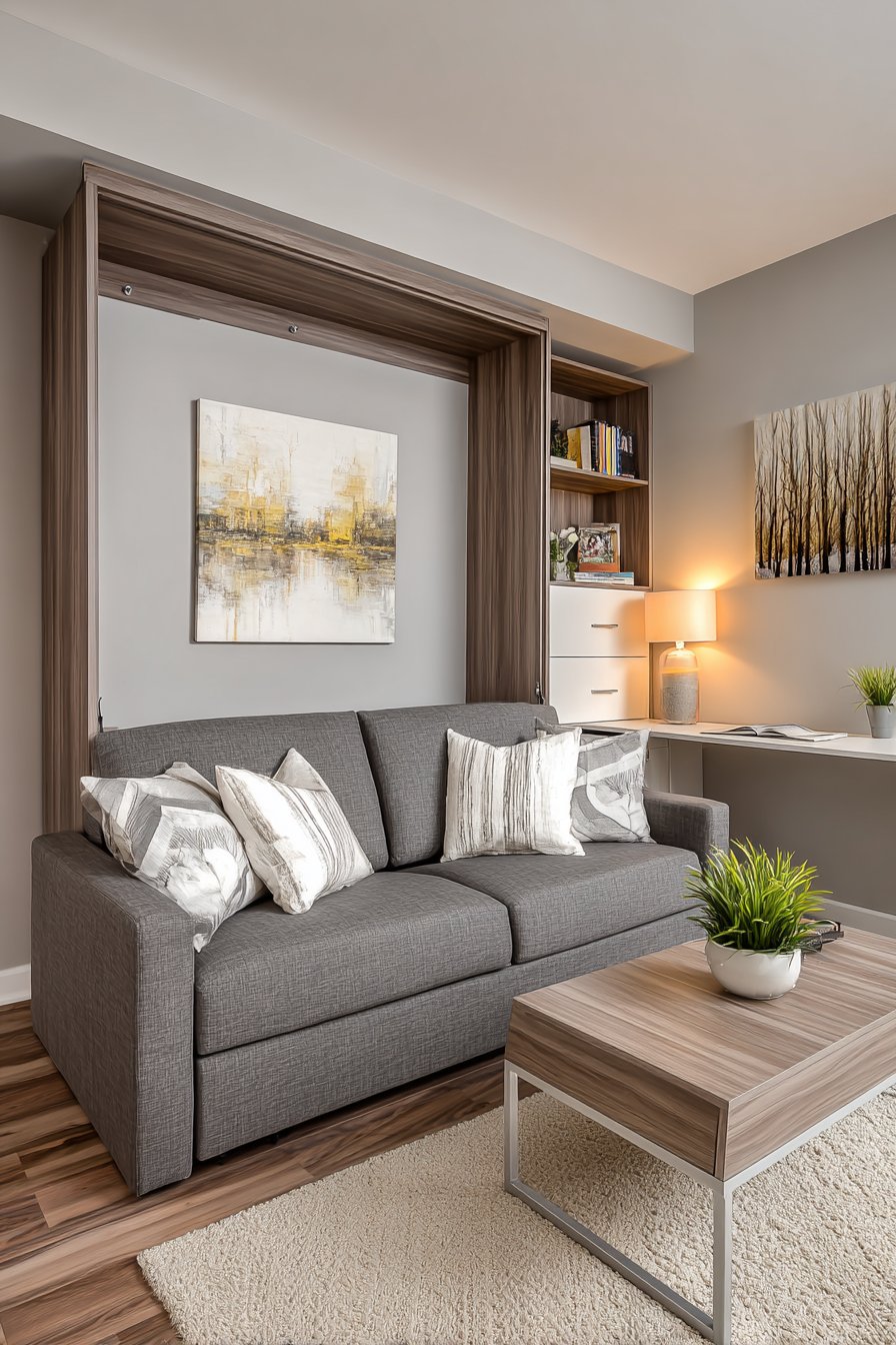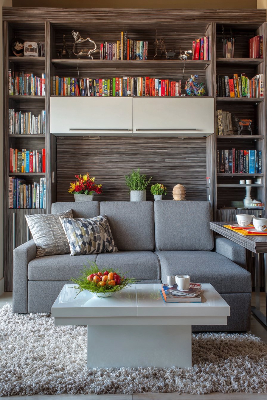 This brilliant living room design tackles one of apartment living’s biggest challenges—making one space serve multiple functions without feeling chaotic or cluttered. The sleeper sofa in medium grey fabric features hidden storage compartments beneath the chaise section, perfect for storing bedding, seasonal clothing, or items you need accessible but not visible. When guests stay overnight, the sofa converts easily to a comfortable bed without requiring you to clear the room or rearrange furniture.