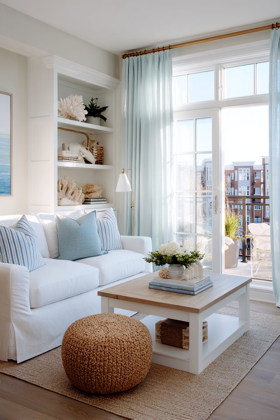 Sheer white curtains allow natural light to flood the space, their gauzy fabric moving gently with air currents and creating that breezy, relaxed atmosphere essential to coastal style. The interior design photography emphasizes this light color palette and relaxed atmosphere, capturing how coastal design brings vacation-home serenity to everyday apartment living. The result is a space that feels perpetually sun-soaked and carefree, providing a mental escape to the beach regardless of your actual location.