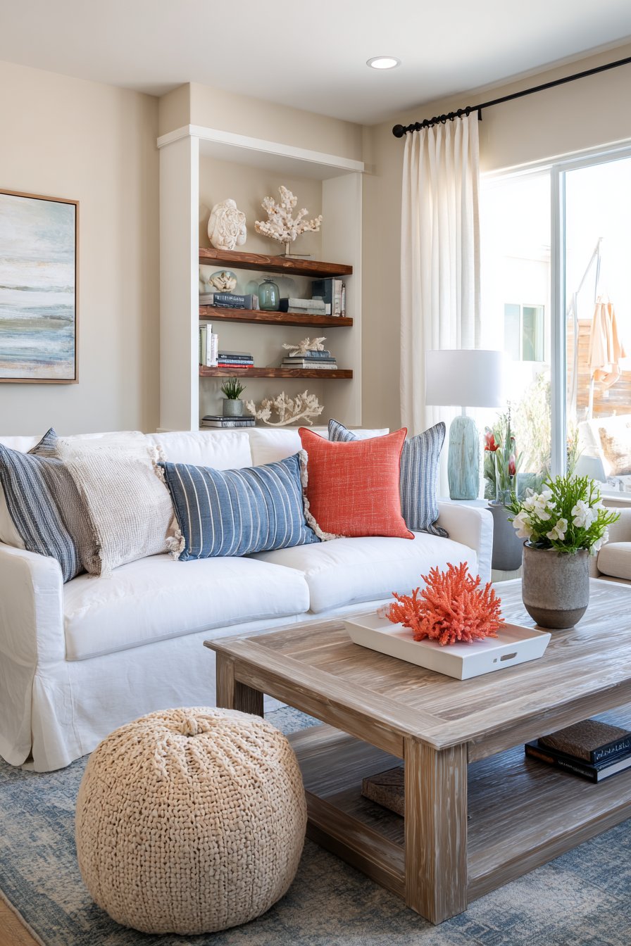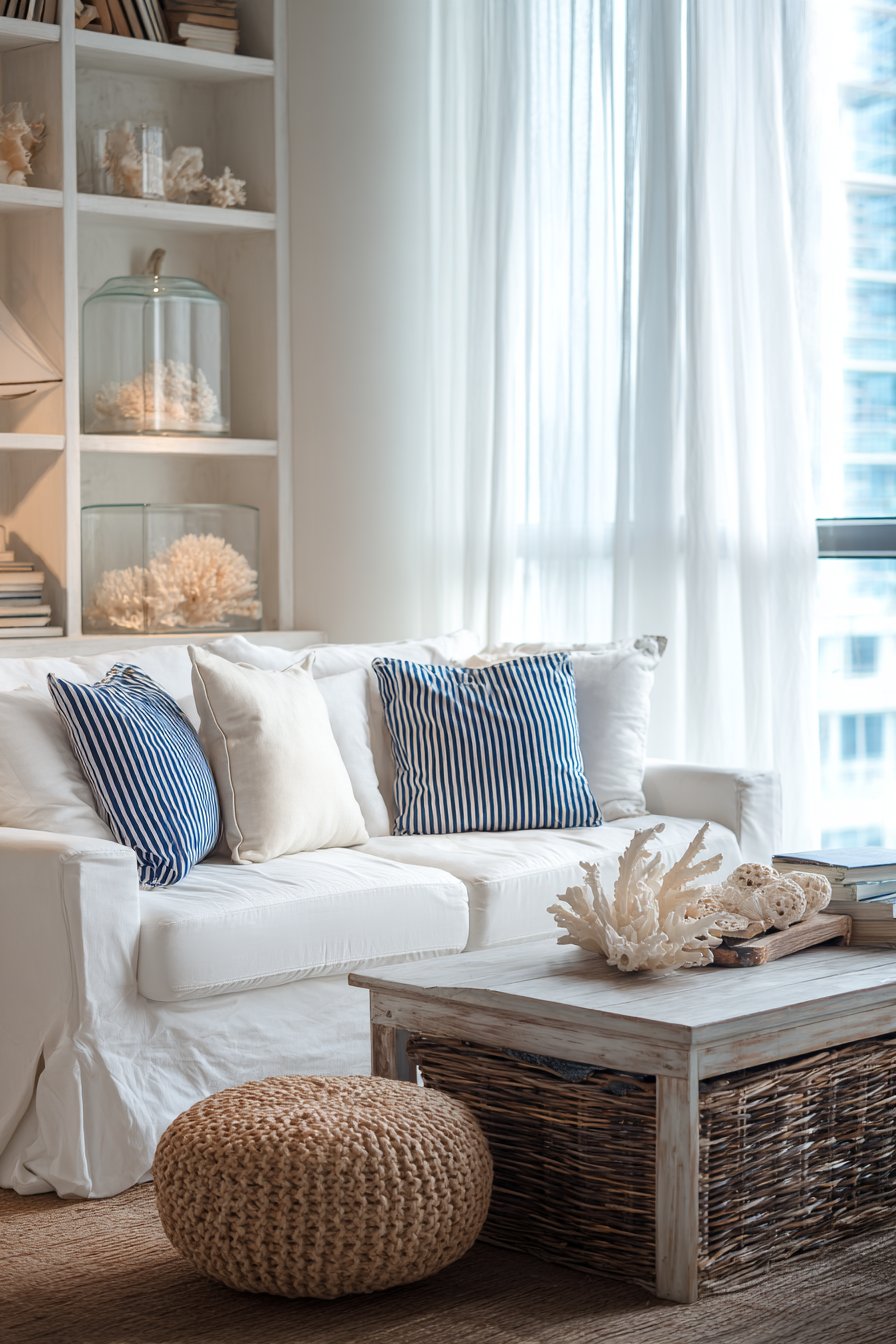 A whitewashed wooden coffee table adds weathered beach house character, its distressed finish suggesting years of sandy feet and sea-salt air even if it’s never left the city. A natural fiber pouf in braided jute or seagrass provides additional seating or serves as a footrest, its organic texture and neutral tone grounding the blue and white palette with earthy warmth. Coral and shell decorative accents arranged thoughtfully on open shelving add thematic touches without becoming kitschy—perhaps a few beautiful shells collected from beach walks, a piece of weathered driftwood, or coral-inspired ceramic objects.